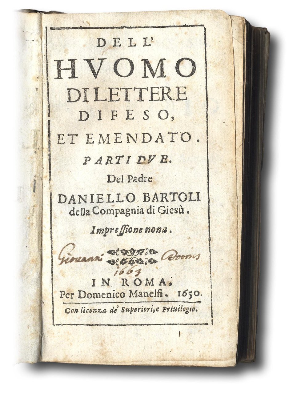 >in-12, (134x79 mm), pp. (10), 434, (10), legatura coeva p. pergamena. Trattatello che ebbe grande successo e diffusione, impresso la prima volta nel 1645. Vari brani sono assai interessanti: armi e lettere, arte del rubare, Galileo lodato per l'utile de' cannocchiali, ladri degli scritti altrui, libri cattivi, Platone prima pittore poi filosofo, sfera d'Archimede, terra veduta dalle stelle.... Daniello Bartoli (Ferrara 1608-1685) ebbe vasta cultura e fu valente predicatore e classico scrittore di storia e letteratura. Bell'esemplare. Gamba 1780. Vinciana 3555.