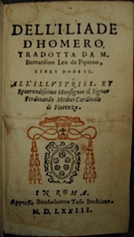 Dell’Iliade tradotta da M. Bernardino Leo da Piperno, Libri dodeci. All’Illustriss. et Reverendissimo Monsignor il Signor Ferdinando Medici cardinale di Fiorenza