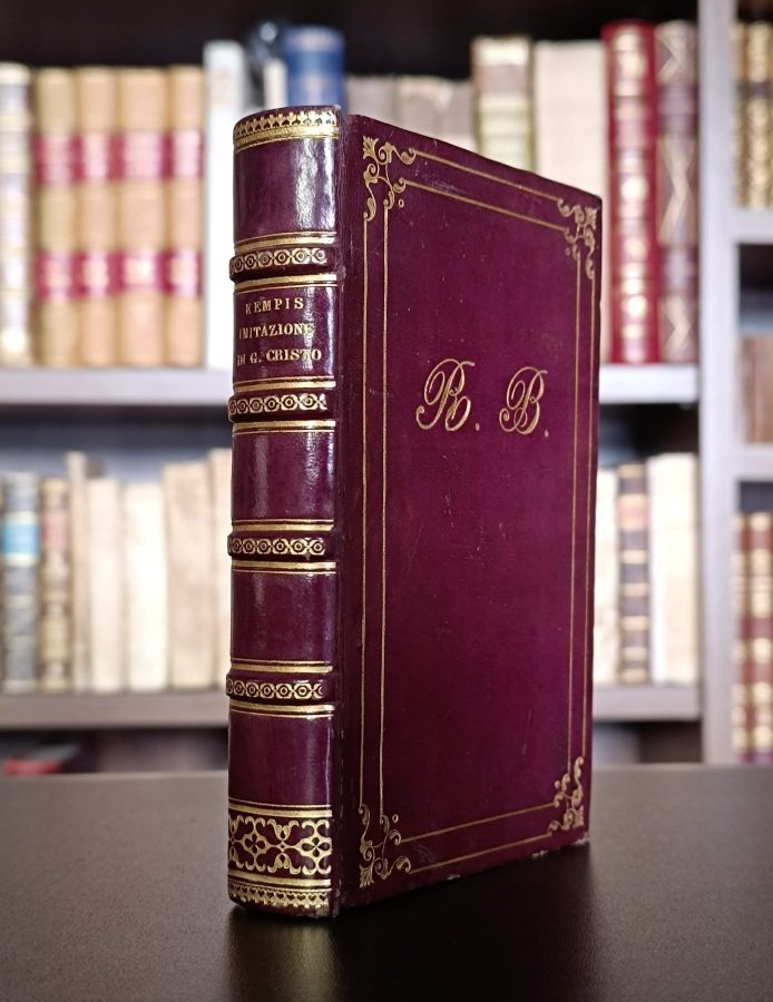 <span style="font-style: normal;">In-8° piccolo (cm. 15,2), pp. VIII 395 [1b] in stato molto buono (lievi fioriture sparse); con 2 tavole incise in rame da G. Maina all'antiporta fuori testo protette da velina. Elegante legatura romantica in pieno vitello </span><i>glacé</i><span style="font-style: normal;"> viola, piatti inquadrati da cornici a due filetti con fregi agli angoli in oro, al centro di quello anteriore il </span><i>supralibros</i> «R. B.» sempre in oro; dorso a nervi con titolo, filetti e fregi in oro; tagli spruzzati e risguardi marmorizzati. Edizione stereotipa eseguita per ordine «dell'illustrissimo e reverendissimo monsignore Omobono Offredi, vescovo di Cremona e conte», con l'aggiunta delle Pratiche e delle Preghiere scritte in lingua francese dal Rev. P. De Gonnelieu della Compagnia di Gesù qui tradotte in italiano. Non comune. Ottimo esemplare. (L)