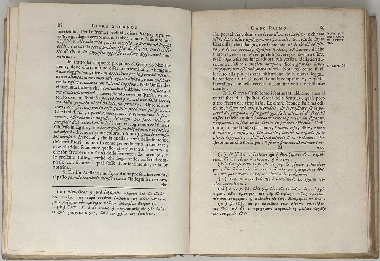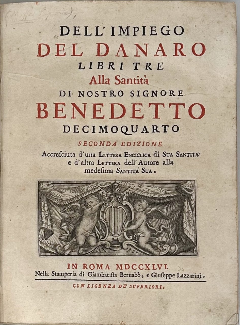 L'opera fu accolta con sospetto dalle autorità ecclesiastiche e con veemente opposizione da parte di Daniele Concina, domenicano e influente moralista, che ne criticò duramente i contenuti. Le polemiche culminarono con l'emanazione dell'enciclica Vix pervenit (1745) dal Pontefice a cui l'opera era originariamente dedicata – che condannava con fermezza ogni forma di usura. In risposta, Maffei fu costretto a rivedere le proprie posizioni nelle edizioni successive. Tuttavia, in questa terza edizione, è ancora ben riconoscibile la forza innovativa del suo pensiero, che anticipa talune istanze del liberalismo economico moderno. Bell'esemplare, fresco e genuino, in eccellente stato di conservazione in legatura originale.