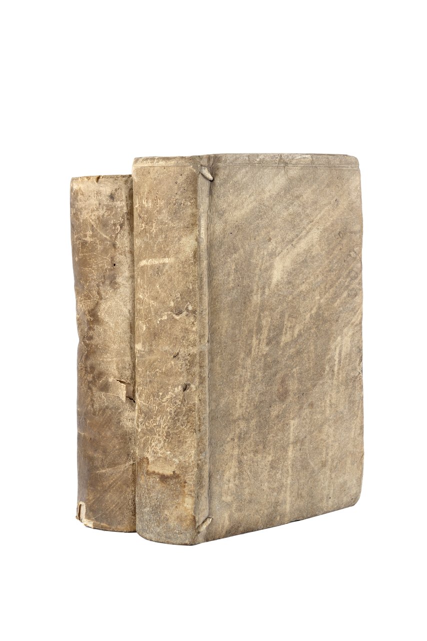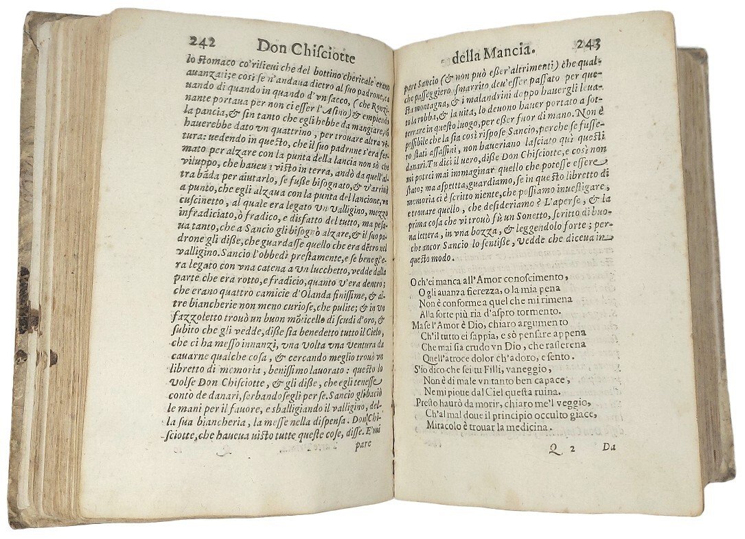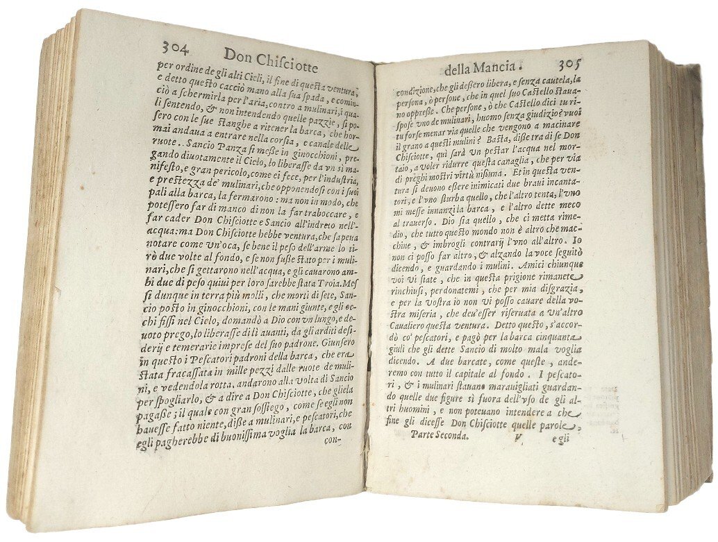 >2 volumi in-8 (160-155x105 mm) pp. (12), 694, (6) (8) 751, legatura omogenea dell'epoca in piena pergamena (benché le due pergamene siano uniformi, le legature differiscono lievemente per misura e tipo di cucitura). Prima traduzione italiana completa: prima edizione della seconda parte e seconda edizione della prima. Il primo volume era stato pubblicato nel 1622, sempre da Andrea Baba, senza i versi a fianco del testo spiegando che non avrebbe influito sull'intelligibilità della storia. Si dovettero aspettare tre anni per un'edizione completa in due volumi: si ristampò anche la prima parte con l'aggiunta dei versi tradotti da Alessandro Adimari.  Il letterato e studioso Lorenzo Franciosini, fiorentino (che aveva già al suo attivo una grammatica e un vocabolario in spagnolo) dedicò al suo Gran Duca Ferdinando II questa sua ''enorme fatica''. Per quanto riguarda il testo L. Rius afferma '...Franciosini tornò por la ediciòn de Bruselas, del ano 1607. Del 1601 e di Milano del 1610'' (cfr. Dante Bernardi in '' Atti delle giornate cervantine'' 1995). Il traduttore settecentesco Jervas afferma, nell'introduzione al suo Chisciotte inglese, che Thomas Shelton, per la sua famosa traduzione del 1612 (la prima in assoluto in qualsiasi lingua) si sia basato non sull'originale spagnolo ma su una copia manoscritta della ''fatica'' del Franciosini. Nel Seicento queste due edizioni italiane del Baba furono soltanto seguite da quella stampata a Roma da Corvo e Lupardi nel 1677. Edizione ambitissima e molto rara sul mercato di uno dei capolavori mondiali di ogni tempo, definita nella prefazione "opera gustosissima, e di grandissimo trattenimento à chi è vago d'impiegar l'ozio in legger battaglie, disfide, incontri, amorosi biglietti, & inaudite prodezze di Cavalieri erranti". Buon esemplare, con firma di possesso coeva al frontespizio: Michelang. Butius. Rom. Esemplare con fioriture sparse e qualche macchia; un po' corto in testa, una pagina (stampata storta) ha il titolo corrente rifilato per metà, mentre la pagina al verso ha 7 mm di margine. L'ultimo f. del vol.II ha un rinforzo lungo il margine interno, che ovvia a tre fori di tarlo che tocca 5 lettere.