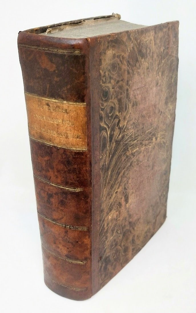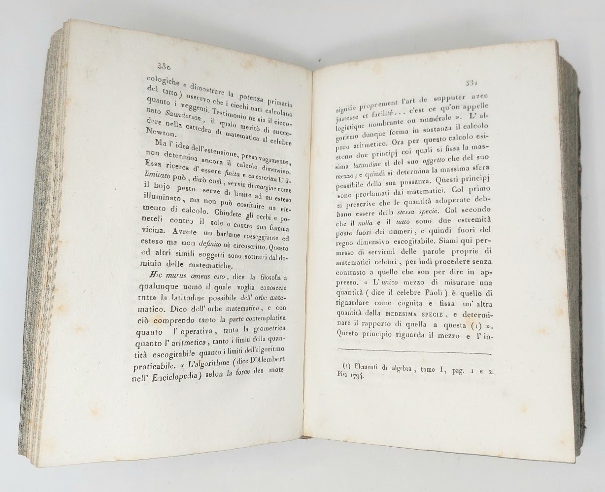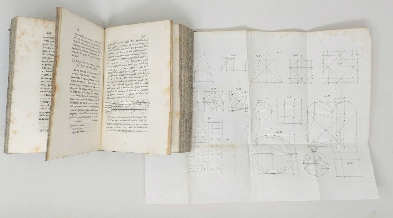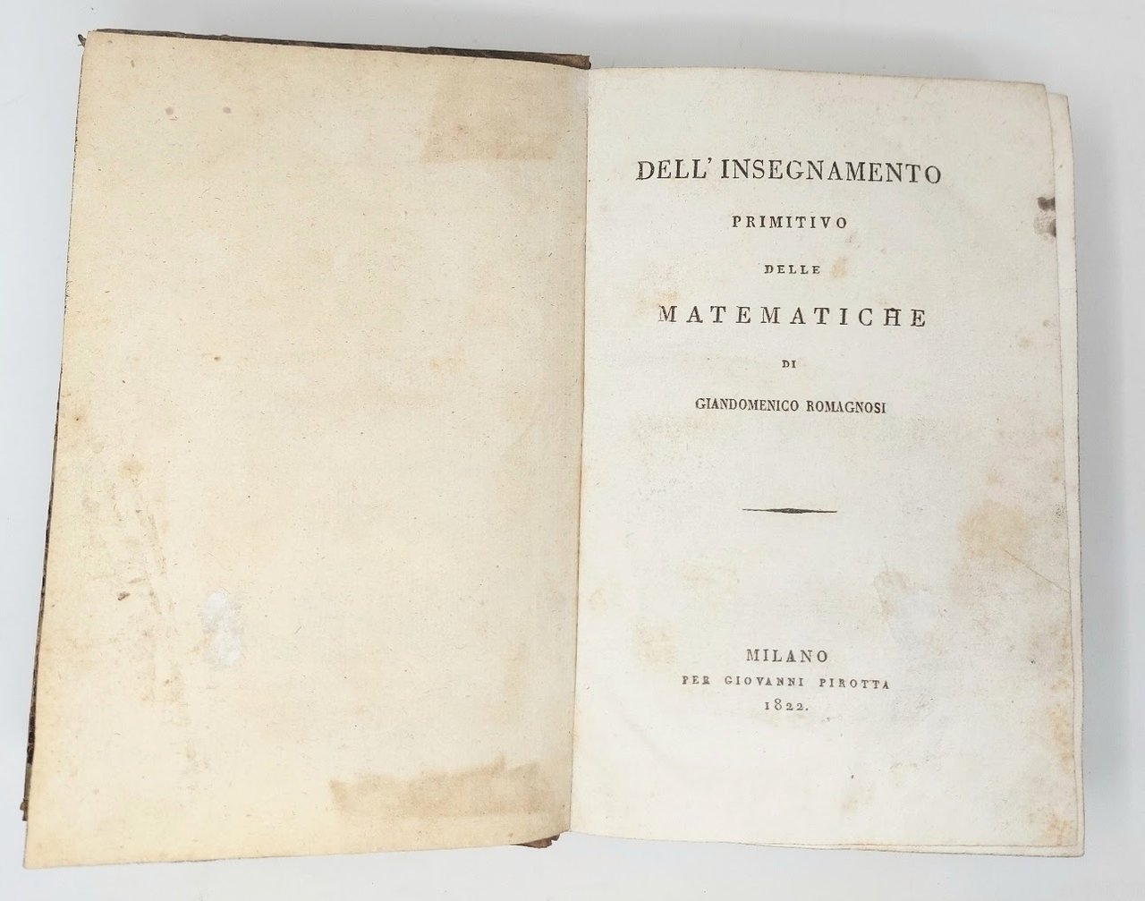>in-8, pp. 805, (3), (8 tavole ripiegate f.t.: tre incisioni in rame, cinque tabelle a stampa), legatura coeva in m. pelle, titolo e filetti in oro al dorso, tagli marmorizzati. Edizione originale, non comune, di questo dotto trattato di filosofia e storia della matematica nei secoli. Nel 1821 Romagnosi (filosofo e fisico, (Salsomagiore 1761, Milano 1835) eminente fisico e giurista, maestro di Carlo Cattaneo, viene arrestato e incarcerato a Venezia con l'accusa di partecipazione alla congiura ordita da Silvio Pellico, Pietro Maroncelli e Federico Confalonieri. E' durante la detenzione che scrive la presente vasta opera, dandola alle stampe l'anno successivo. Prosciolto dalle accuse, gli verrà vietato l'insegnamento. Buon esemplare, ad ampi margini. Manca alla bibliografia di Riccardi sulla matematica italiana,