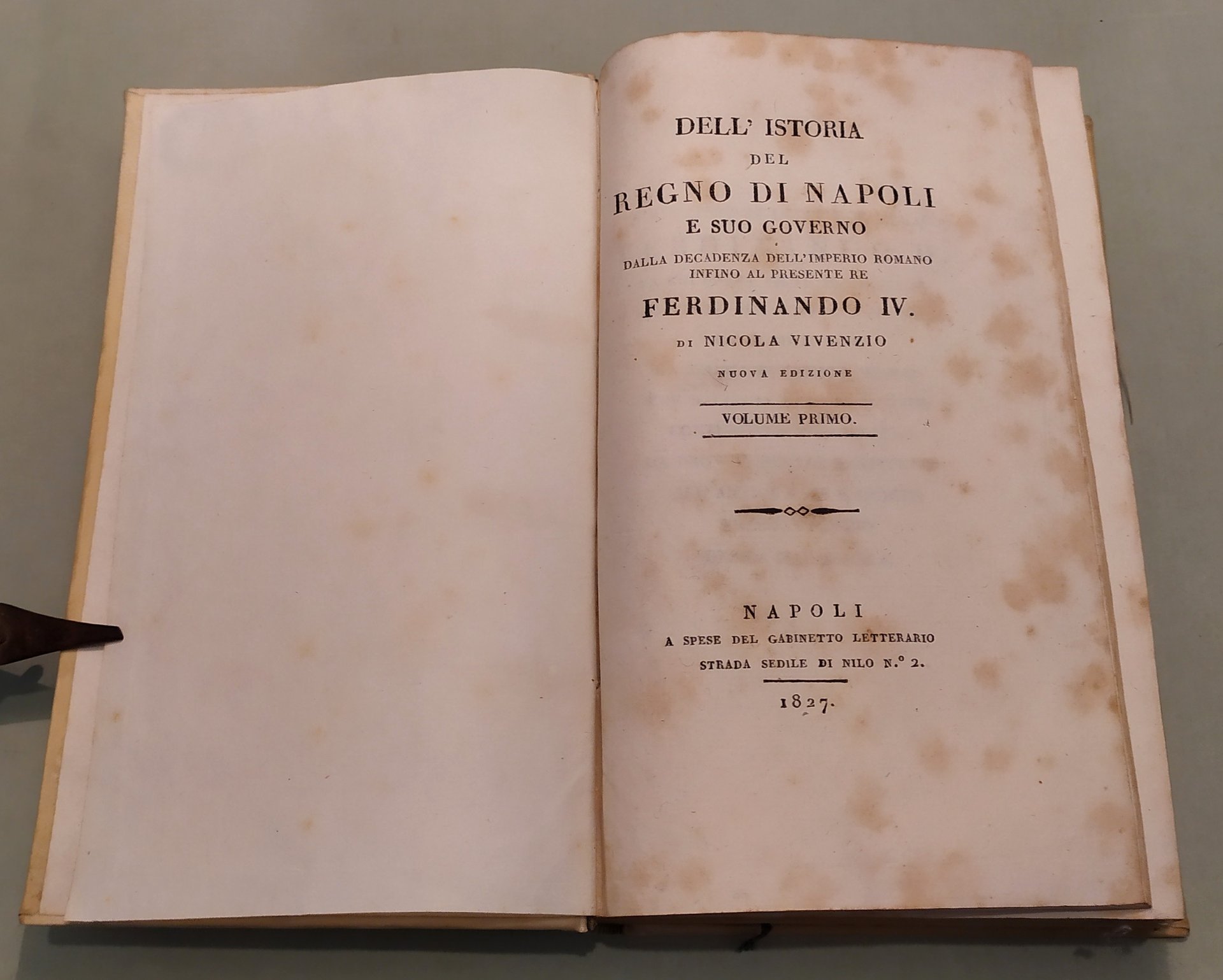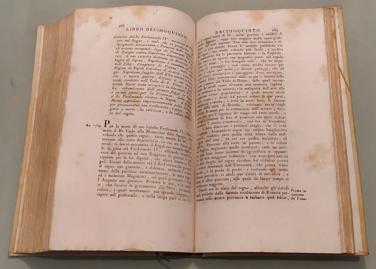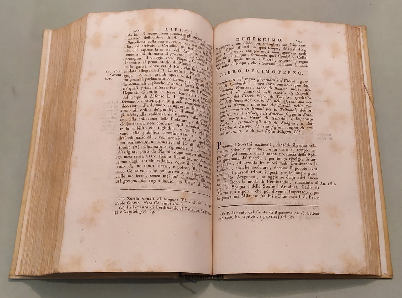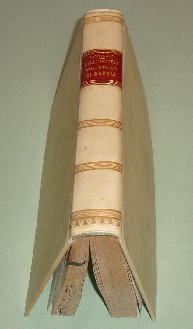 Napoli, a spese del Gabinetto Letterario, 1827. Due tomi in un volume in 8vo; pp.232 (err.num.192), 334, 2n.nn. Errori nella numerazione. Pergamena coeva, dorso a cordoni con titolo e fregi in oro, tassello. Avviso al lettore: "Nella presente edizione si trovano delle correzioni, ed alcune giunte, che l'Autore ha creduto dovervi fare. E siccome prima questa Storia terminava alla partenza da Napoli del glorioso Re Carlo III, oggi l’Autore l'ha proseguita da quel tempo infino a' nostri giorni".