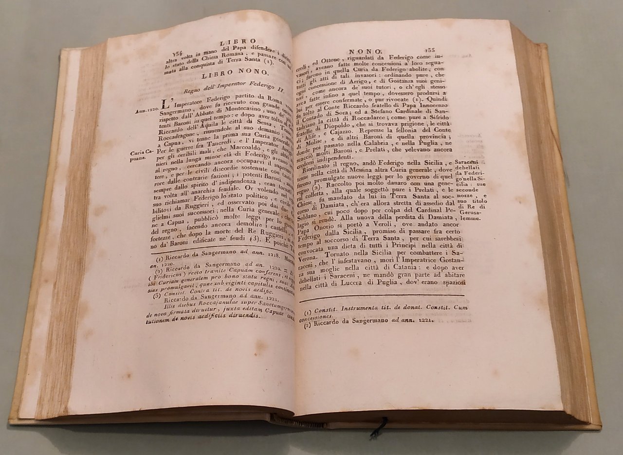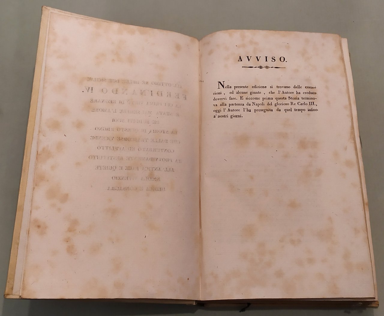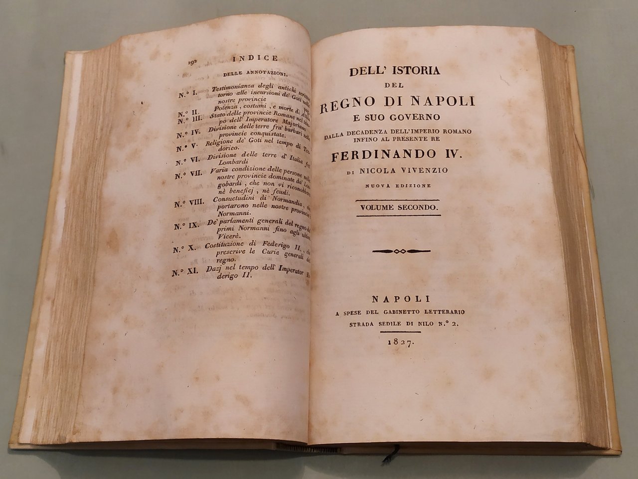 Napoli, a spese del Gabinetto Letterario, 1827. Due tomi in un volume in 8vo; pp.232 (err.num.192), 334, 2n.nn. Errori nella numerazione. Pergamena coeva, dorso a cordoni con titolo e fregi in oro, tassello. Avviso al lettore: "Nella presente edizione si trovano delle correzioni, ed alcune giunte, che l'Autore ha creduto dovervi fare. E siccome prima questa Storia terminava alla partenza da Napoli del glorioso Re Carlo III, oggi l’Autore l'ha proseguita da quel tempo infino a' nostri giorni".