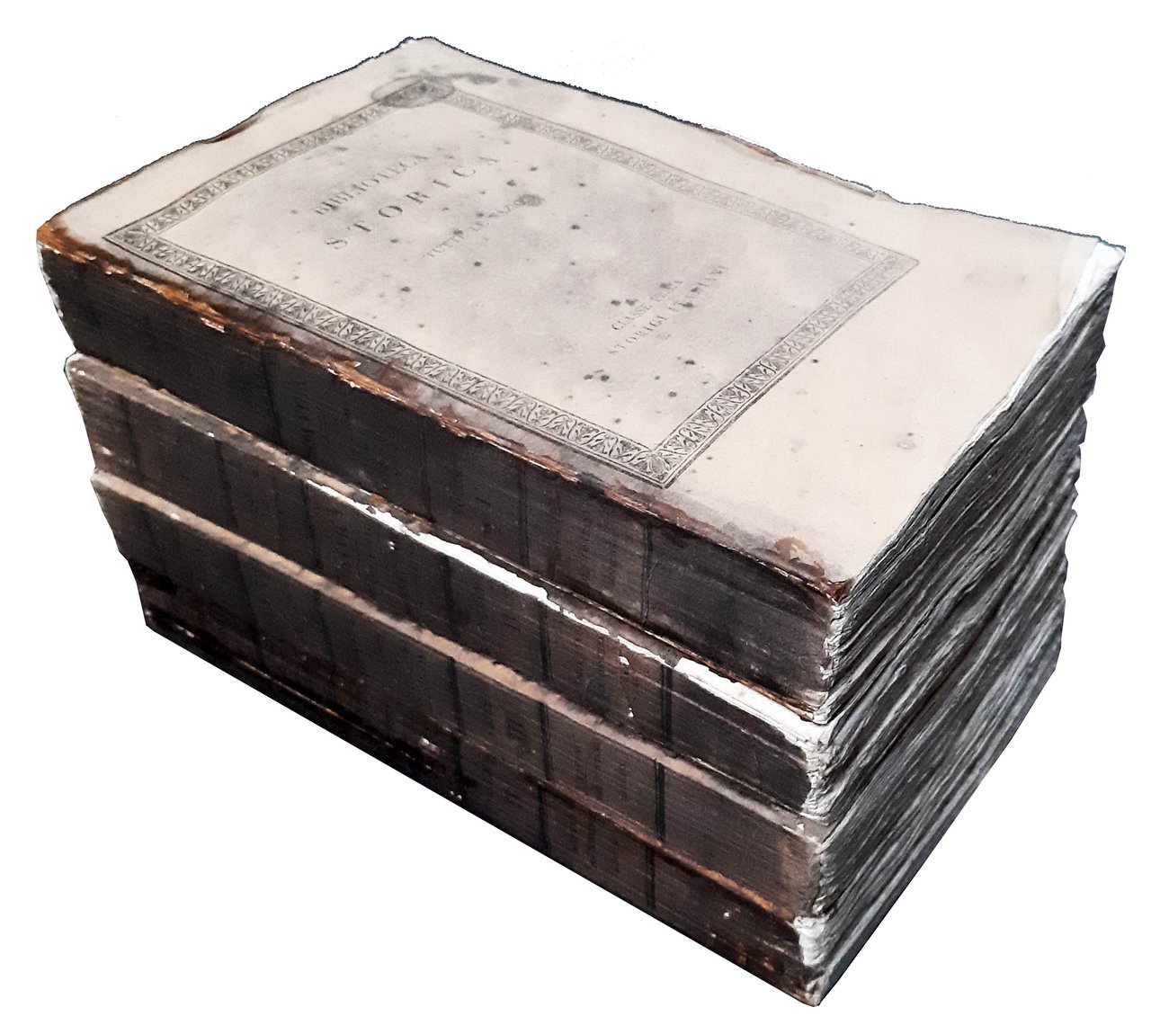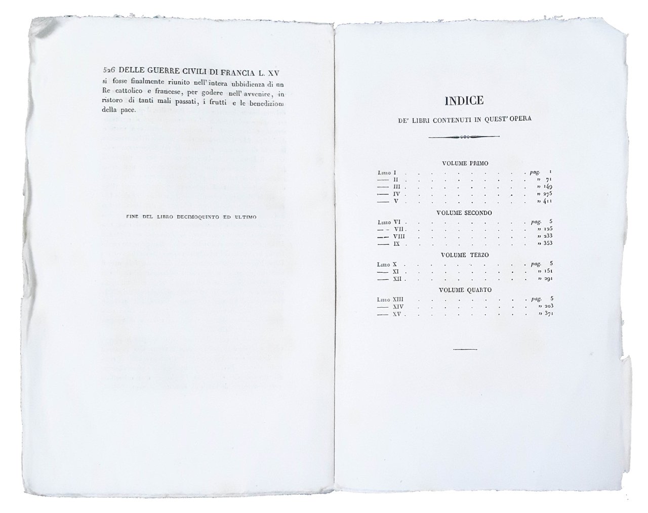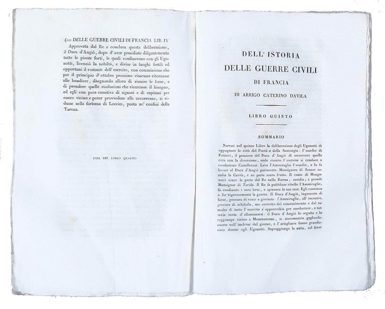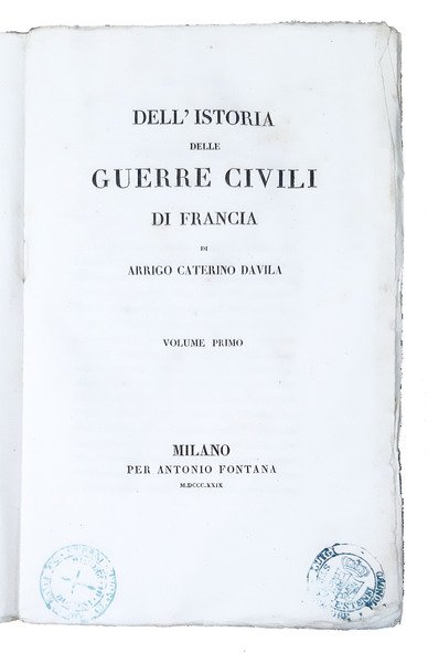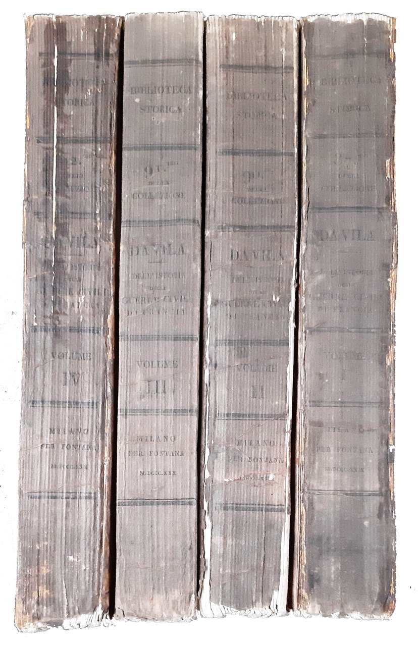 in-4°, 230x146 mm, leg. in brossura editoriale con copertina in carta leggera, fregi e titoli in nero; opera in 4 volumi; pp. [2], X, 554, [2]; 476; 455, [1]; 526, [2]. Opera appartenente alla collezione "Biblioteca storica di tutte le nazioni. Classe prima". Arrigo (Enrico) Caterino Davila (1576-1631) è stato un militare, scrittore e storico italiano. Prov.: Antichi timbri tondi a inchiostro blu al frontespizio del primo volume (Luigi Cagnoli - Censore - Stati Estensi; Francesco Strani - Censore - Diocesi di Reggio) e al verso dell'occhietto del secondo volume (Prof. Giovanni Bianchi - Censore - Stati Estensi; Dott. Gius. Merganti - Censore - Diocesi di Modena). Rif.: IT\ICCU\UBOE\021425. OCLC, 490414574. Cond.: Segni d'uso alla legatura (strappi sui bordi, alcune mancanze alle cuffie, forti bruniture al dorso, macchie, restauri con sostituzione di alcuni piatti). Carte in barbe, con occasionali fioriture. Opera in condizioni generali abbastanza buone.
