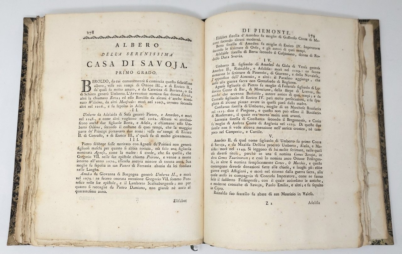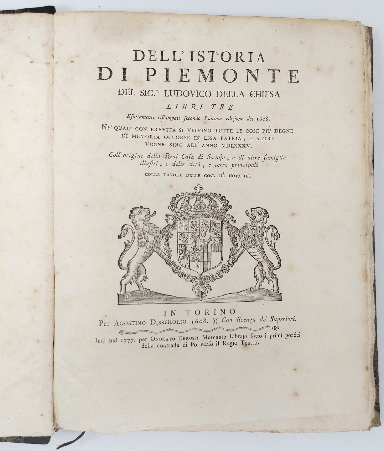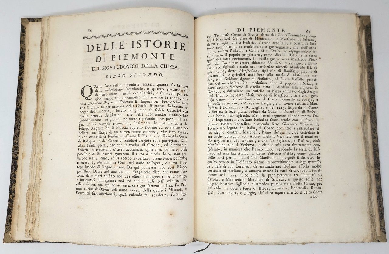 >In-4, pp. (22), 232, leg. coeva m. pelle verde, titolo e fregi in oro al dorso. Stemma sabaudo sul titolo, testatine e capilettera incisi in sillografia. In fine, ''Indice, o sia catalogo di tutti i Principi, che hanno dominato in Piemonte, e paesi vicini secondo l'ordine de'tempi, che dominarono da mille anni in qua''. Riedizione settecentesca di un'opera storica di estrema importanza, pubblicata per la prima volta nel 1601 col titolo ''Compendio dell'Historia del Piemonte'' e poi col titolo definitivo e in forma assai ampliata nel 1608. "Si tratta della prima storia del Piemonte che possa essere interpretata come un tentativo organico di avviare ad un coordinamento la storia della regione sabauda che sino ad allora era stata sempre considerata come una delle regioni d'Italia più povere di scritti storici..." (Diz. Biogr. Italiani, XXXVI, p. 756 - 757). Della Chiesa, noto come ''il Muratori del Piemonte'', nato a Saluzzo nel 1568 e morto a Torino nel 1621, fu autore di numerose e significative opere storiografiche. Ottimo esemplare a pieni margini. Manno, I, 102 e 1019. Lozzi, II, 3605. Cat.