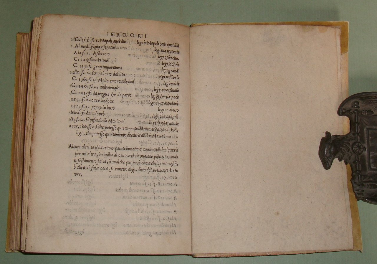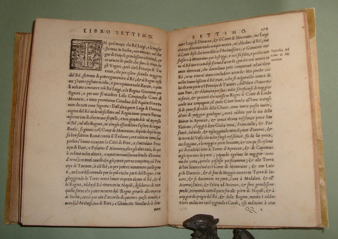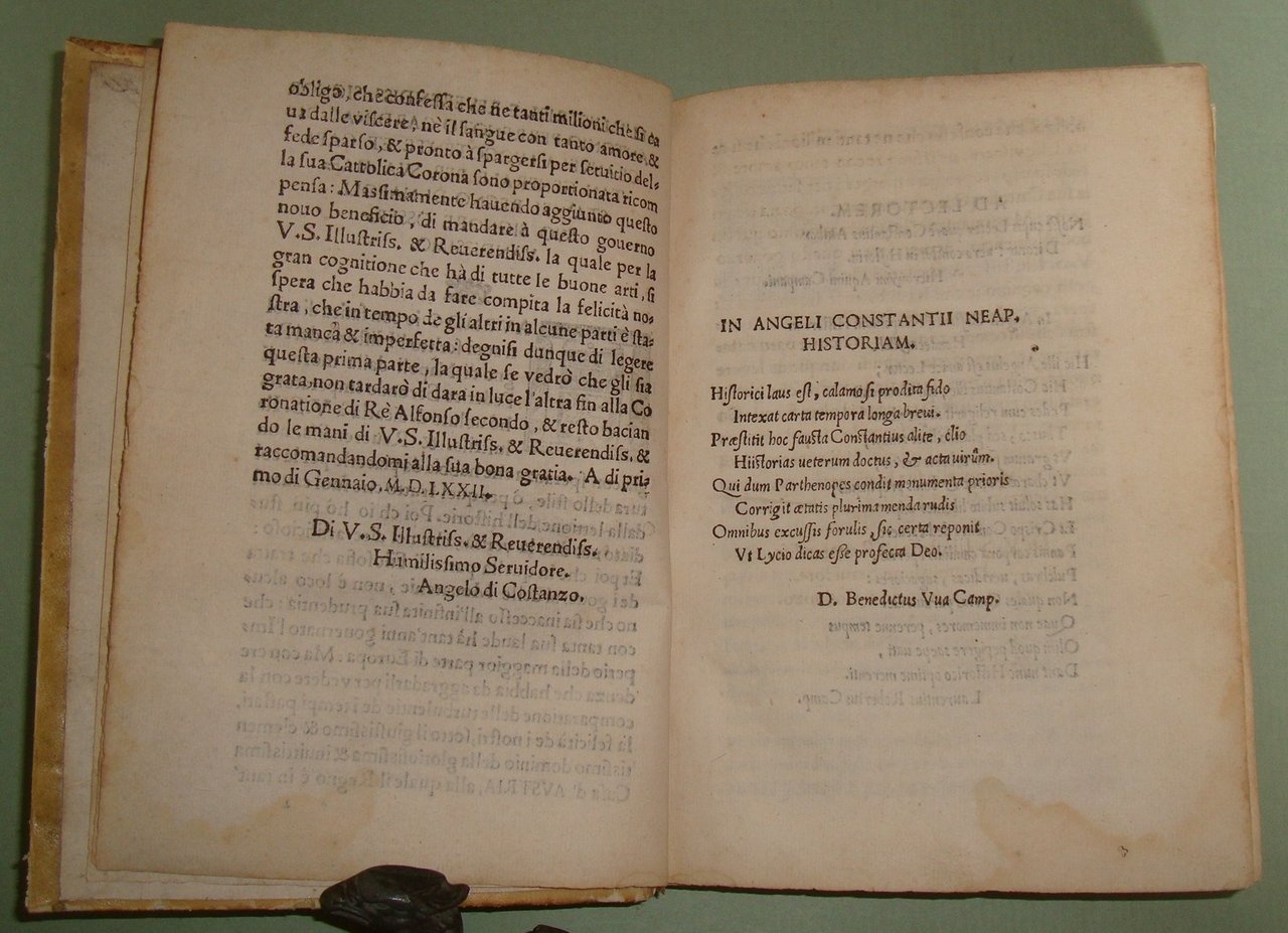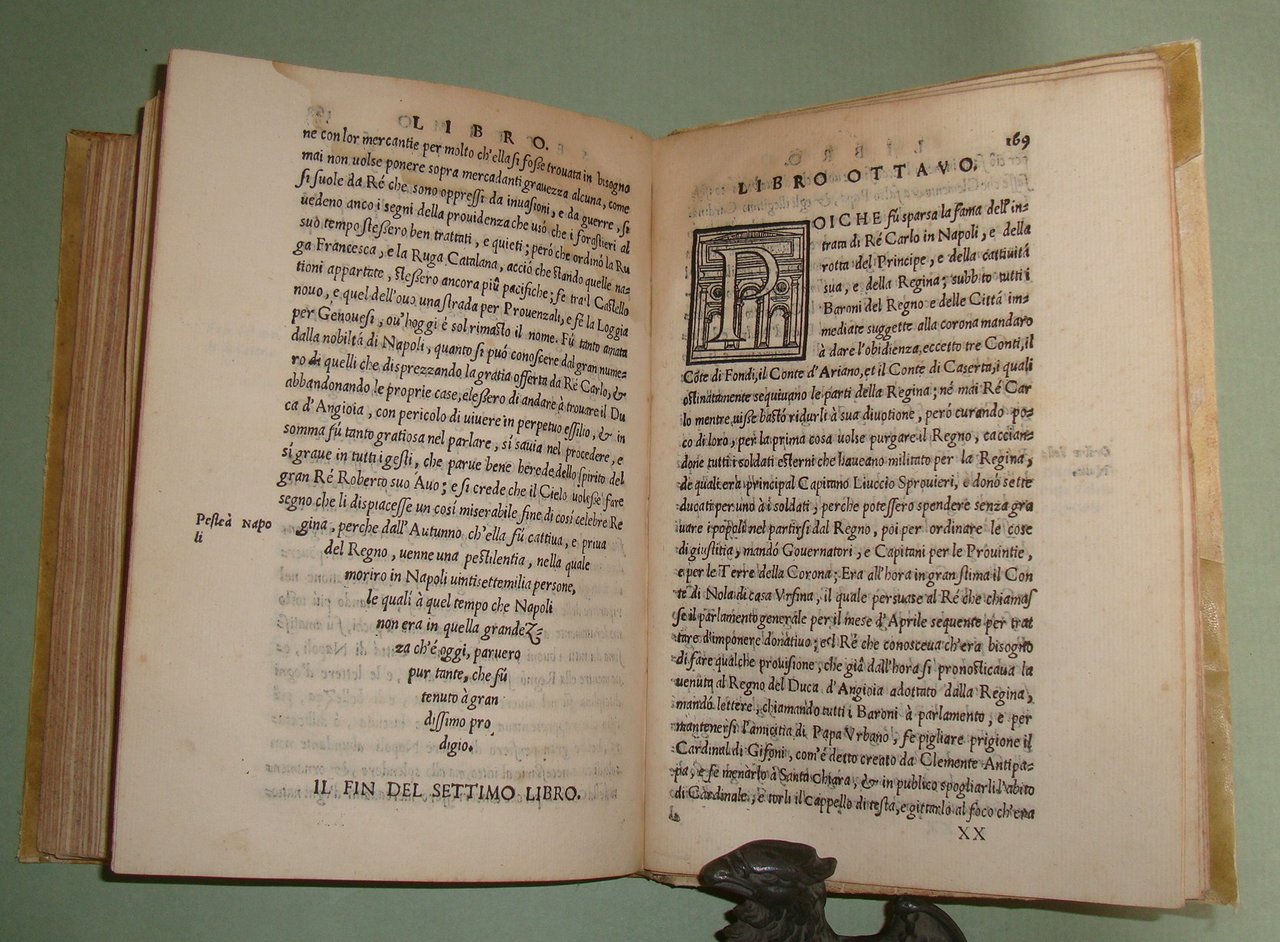 In Napoli, appresso Mattia Cancer, 1572. In 8vo (cm.15x21); cc.4n.nn. con frontespizio, dedica, epigramma di D.Benedetto Uva e distico di Gerolamo Aquino, prefazione di Giovanni Giacomo Monacello da Campobasso; cc.3 n.nn. con proemio; 1 carta bianca; cc. numerate 188; cc.2n.nn. con registro e "gli errori più notabili fatti nella stampa". Pergamena coeva, titolo calligrafto al dorso, profili restaurati. Manzi, Annali di Mattia Cancer 142: "Prima edizione. La medesima con le Aggiunte di altri XII Libri fu stampata in L'Aquila da Giuseppe Cacchi nel 1581"; Brunet II 322, nota. Rarissimo.