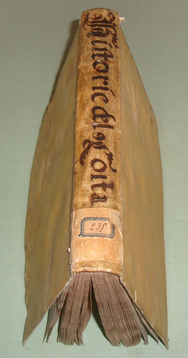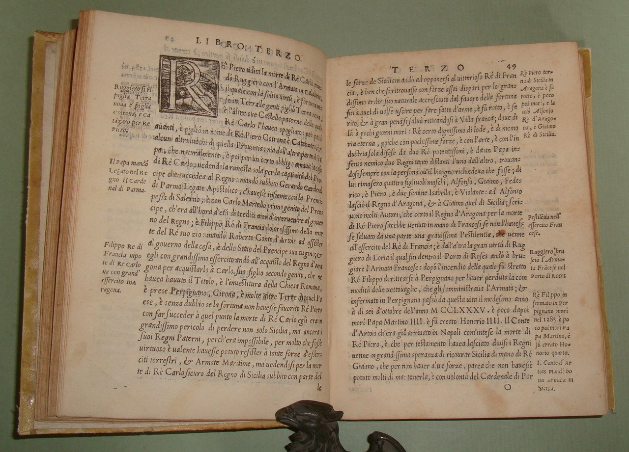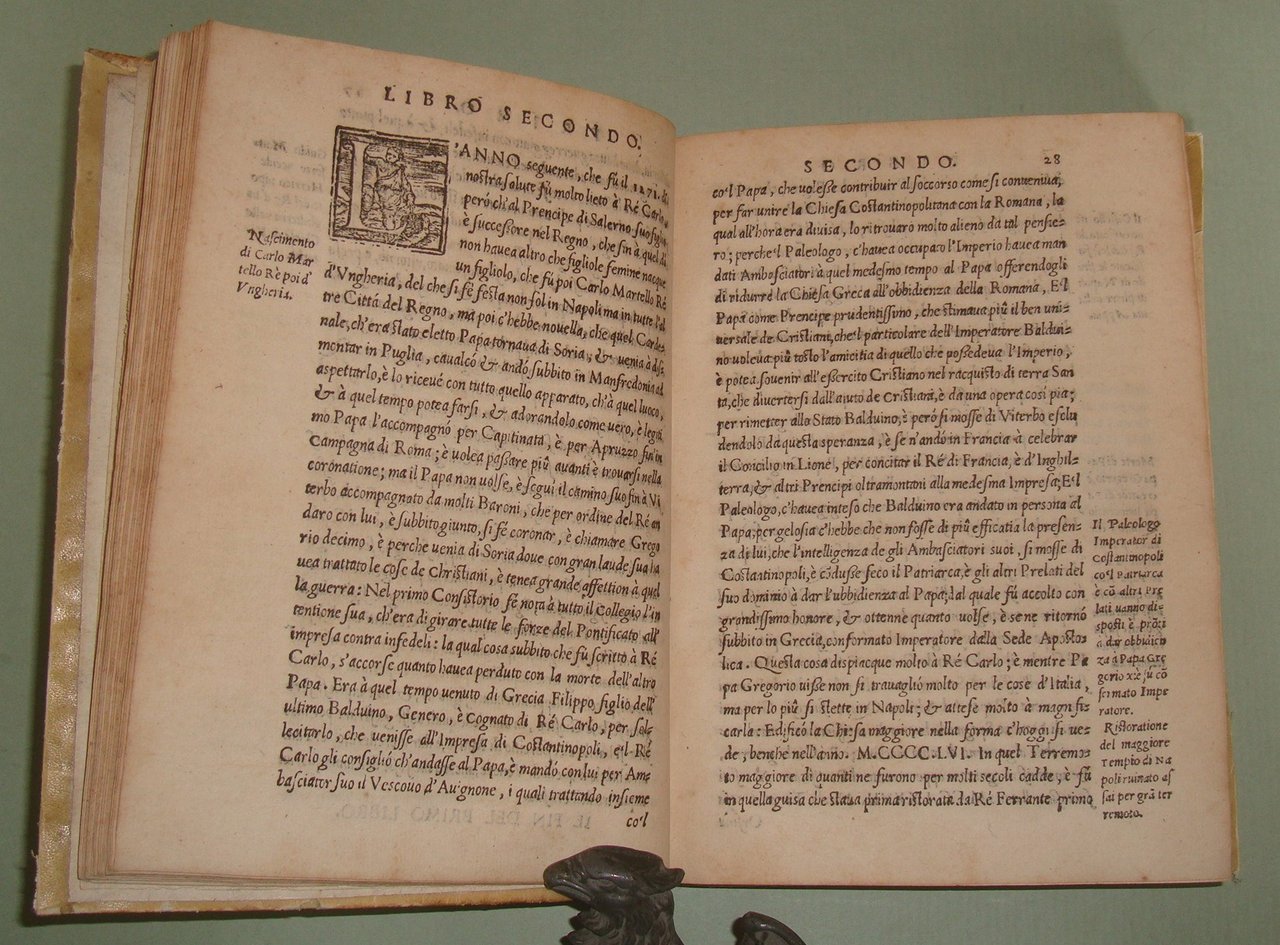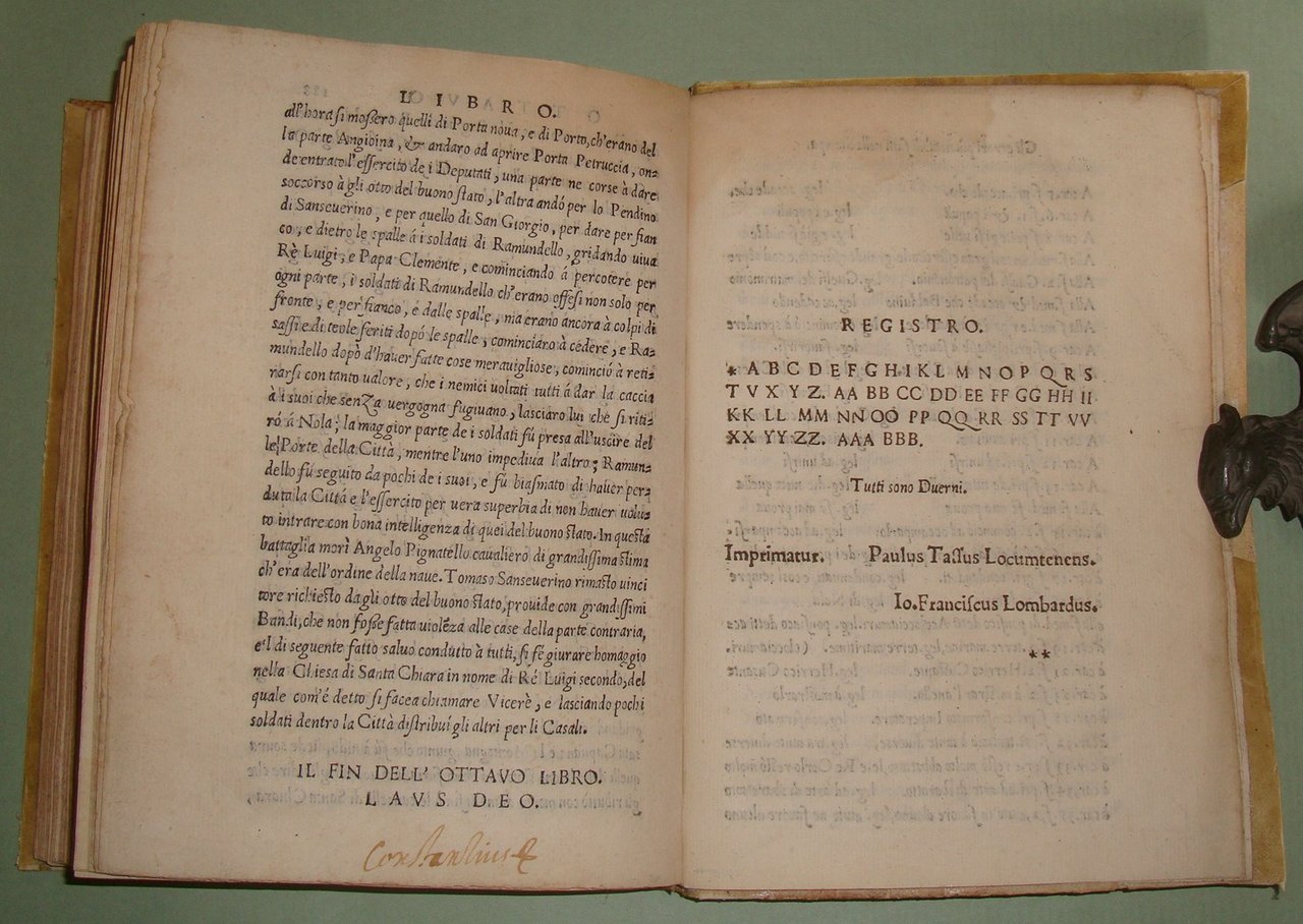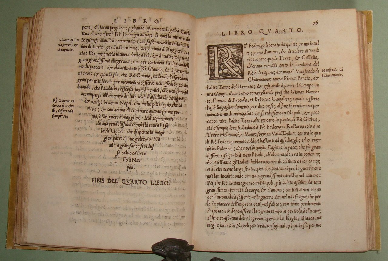 In Napoli, appresso Mattia Cancer, 1572. In 8vo (cm.15x21); cc.4n.nn. con frontespizio, dedica, epigramma di D.Benedetto Uva e distico di Gerolamo Aquino, prefazione di Giovanni Giacomo Monacello da Campobasso; cc.3 n.nn. con proemio; 1 carta bianca; cc. numerate 188; cc.2n.nn. con registro e "gli errori più notabili fatti nella stampa". Pergamena coeva, titolo calligrafto al dorso, profili restaurati. Manzi, Annali di Mattia Cancer 142: "Prima edizione. La medesima con le Aggiunte di altri XII Libri fu stampata in L'Aquila da Giuseppe Cacchi nel 1581"; Brunet II 322, nota. Rarissimo.