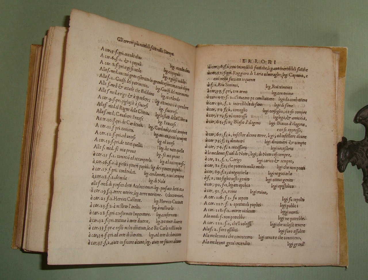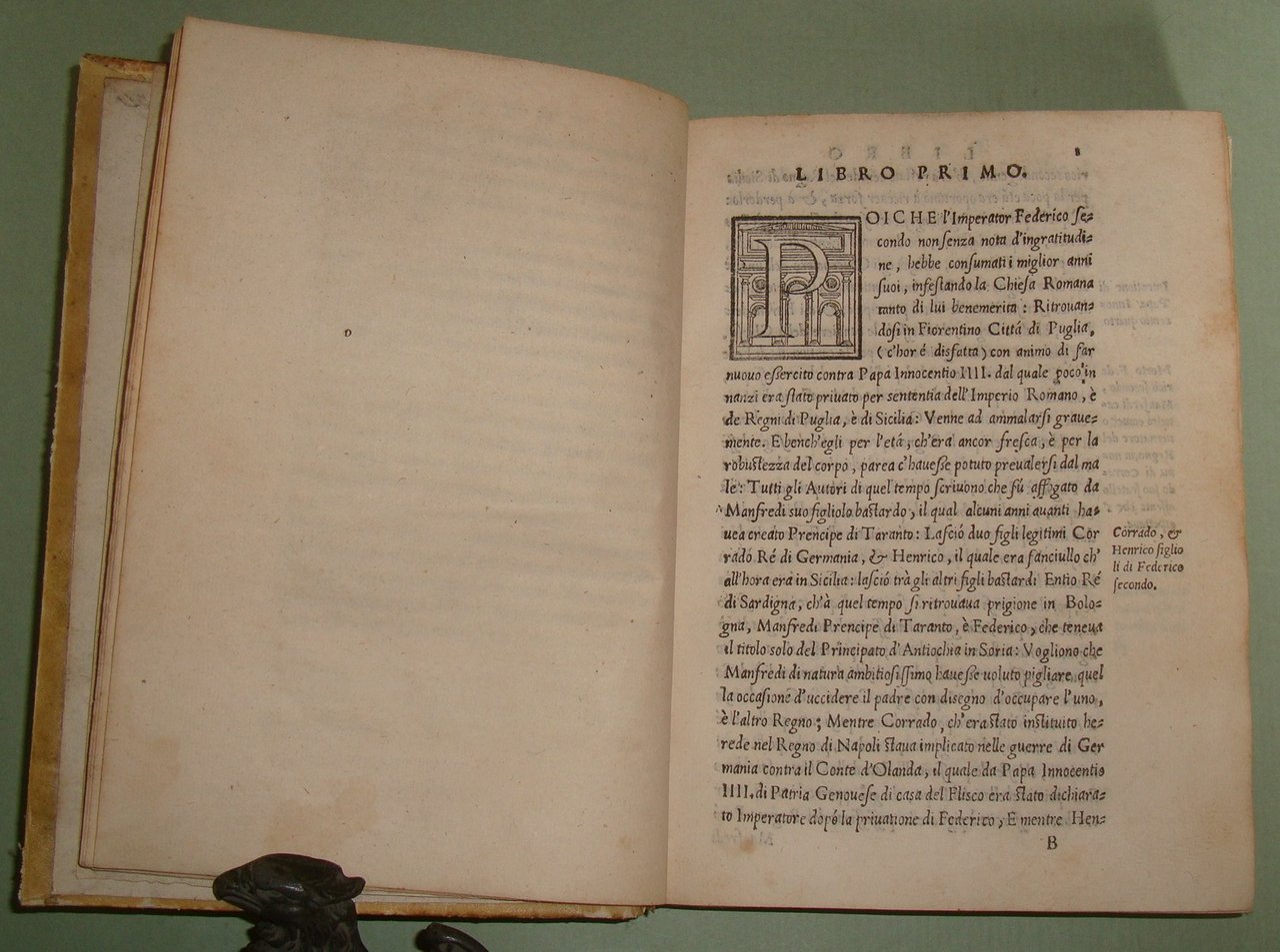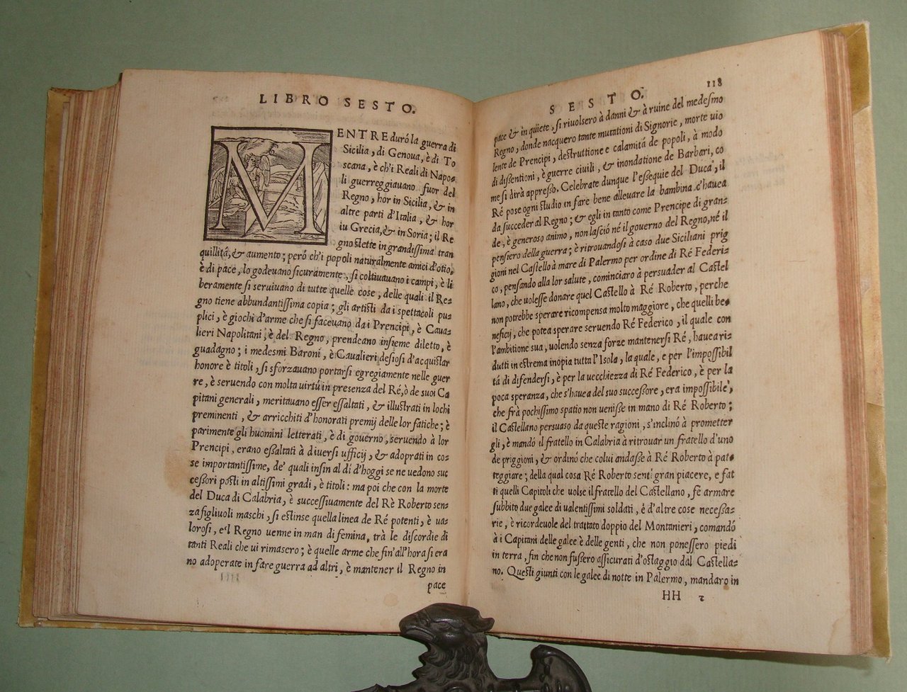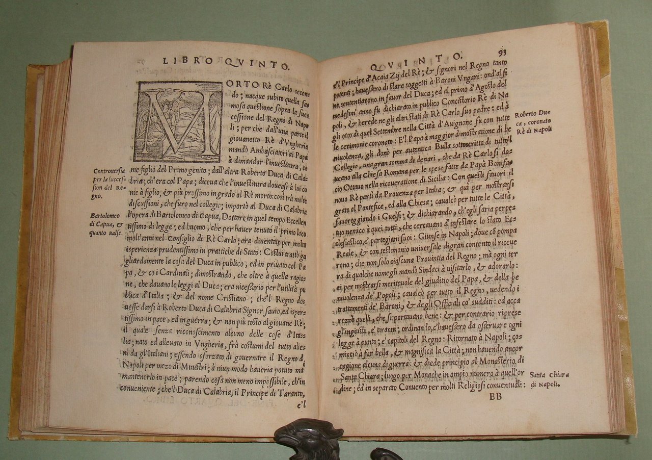 In Napoli, appresso Mattia Cancer, 1572. In 8vo (cm.15x21); cc.4n.nn. con frontespizio, dedica, epigramma di D.Benedetto Uva e distico di Gerolamo Aquino, prefazione di Giovanni Giacomo Monacello da Campobasso; cc.3 n.nn. con proemio; 1 carta bianca; cc. numerate 188; cc.2n.nn. con registro e "gli errori più notabili fatti nella stampa". Pergamena coeva, titolo calligrafto al dorso, profili restaurati. Manzi, Annali di Mattia Cancer 142: "Prima edizione. La medesima con le Aggiunte di altri XII Libri fu stampata in L'Aquila da Giuseppe Cacchi nel 1581"; Brunet II 322, nota. Rarissimo.