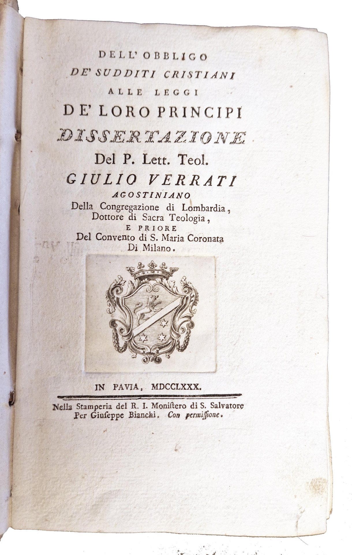 Dell'obbligo de' sudditi cristiani alle leggi de' loro principi dissertazione del p. lett. teol. Giulio Verrati […].