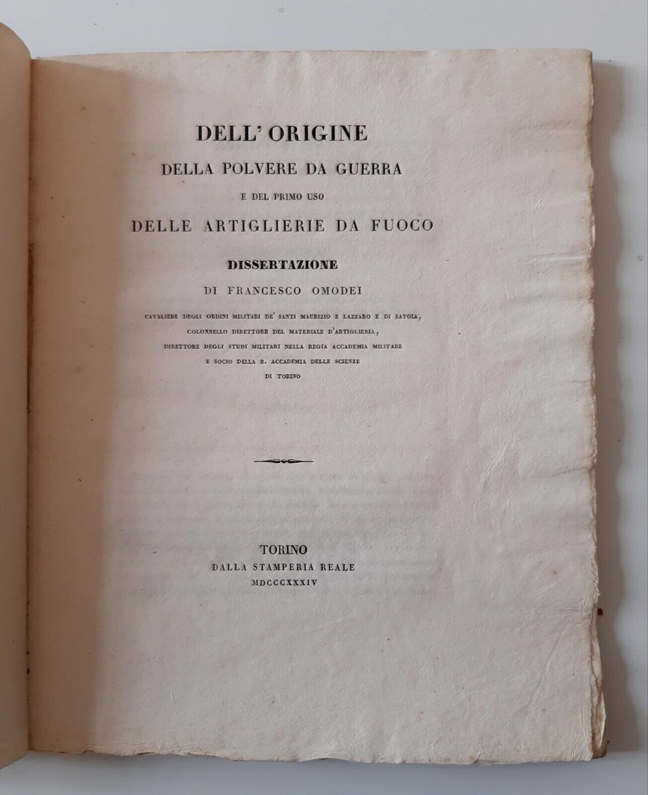 DELL'ORIGINE DELLA POLVERE DA GUERRA DI F. OMODEI TORINO STAMPERIA REALE 1834