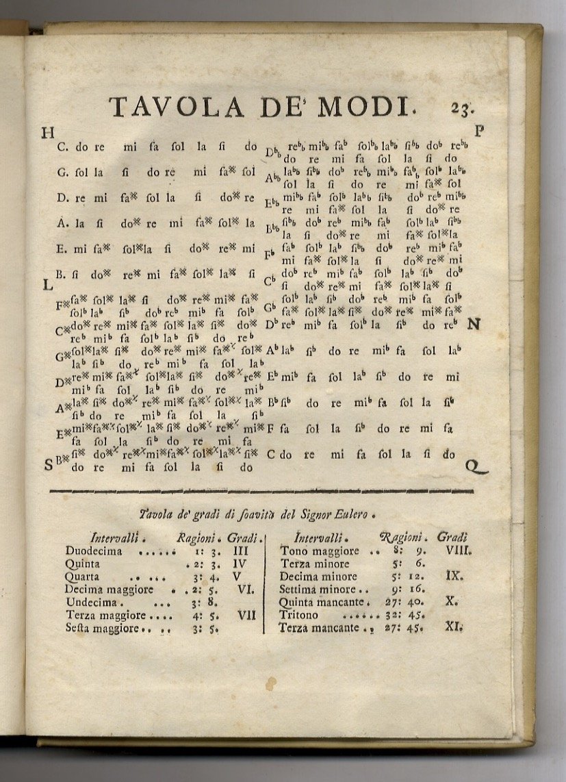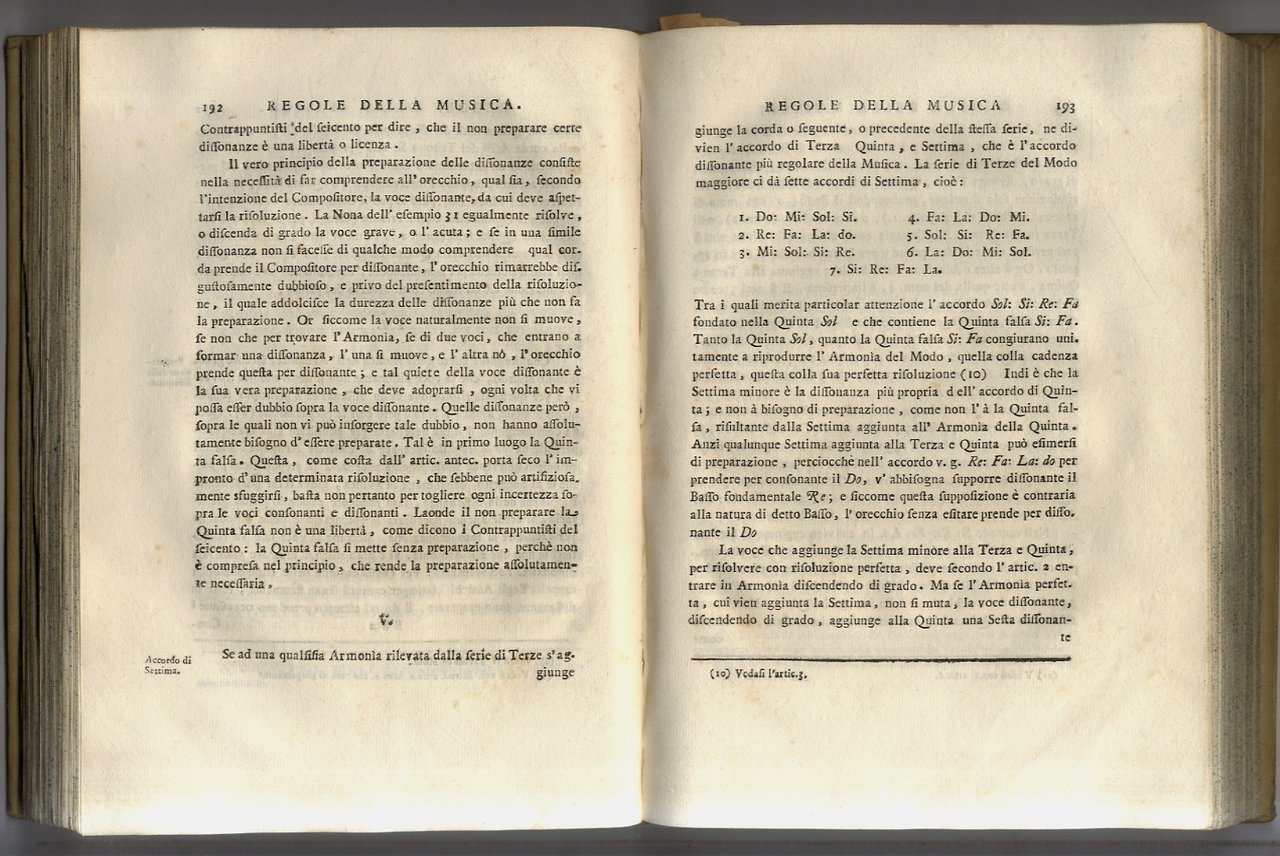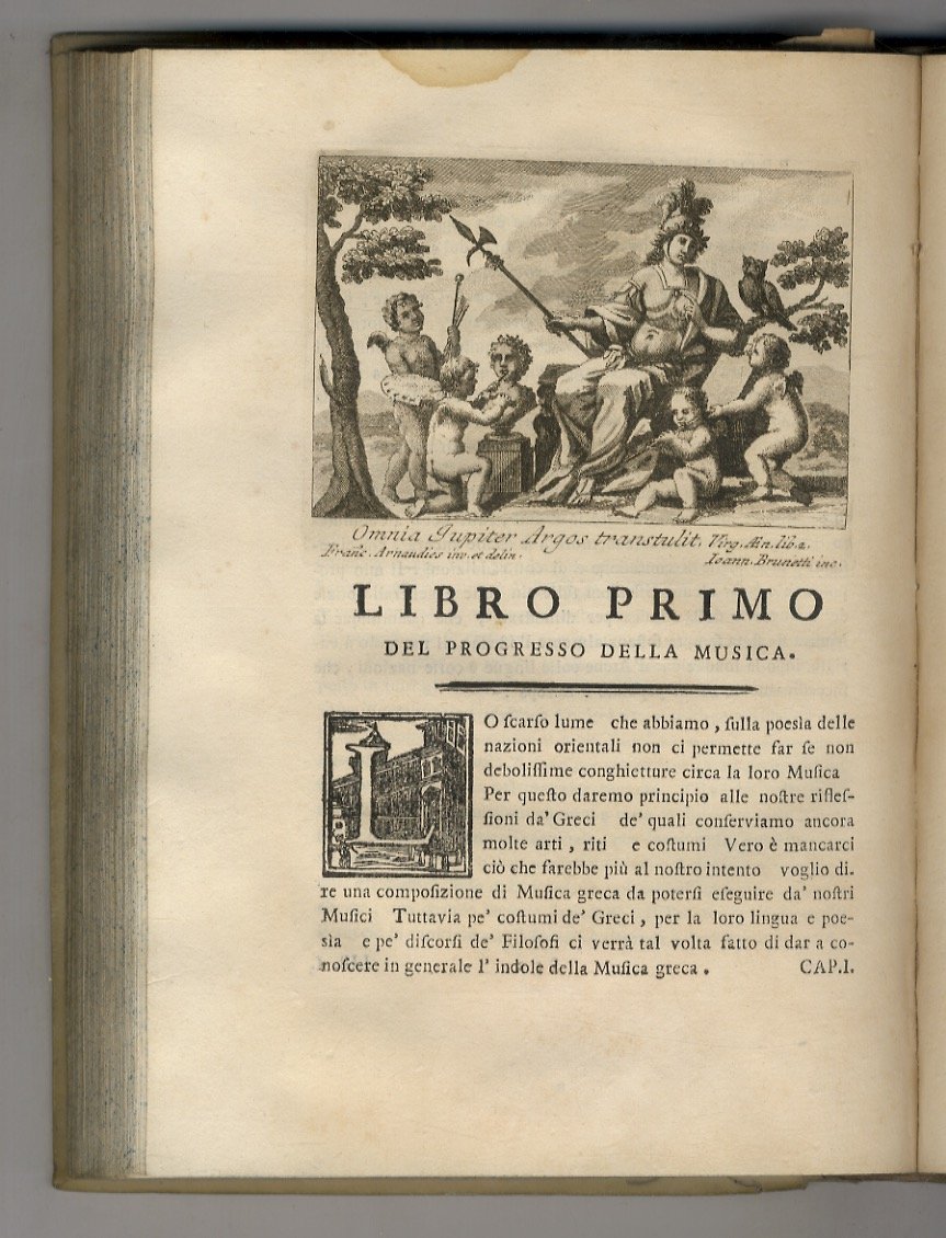 Roma, nella stamperia di Michel'Angelo Barbiellini nel palazzo Massimi, 1774, in-4, legatura della metà dell'Ottocento in piena pergamena, dorso con titolo in oro su tassello in pelle e ricchi fregi, sempre in oro, in stile neorococò, tagli spruzzati, pp. [12], 466, [2]. Con errori di paginazione. Una tavola a stampa f.t. in fine: "Tavola de' Modi". Vignette calcografiche nel testo disegnate da Franco Arnaudies Catalano e incise da Giovanni Brunetti. Mancano le 23 tavole incise in rame (ritratto della dedicataria e musica notata).
