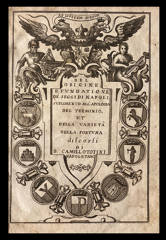 (Napoli-Ediz. ‘600) TUTINI Camillo. Dell’origine e fundatione de Seggi di Napoli. Del tempo in che furono instituiti, e della separation de’ Nobili dal Popolo, delle leggi di ciaschedun seggio intorno all’Aggregation delle famiglie: Del Cingolo Militare, che anticamente si data da Nobili, & da Popolani, & della Giuridittione dell’Eletto del Popolo. Del supplemento al Terminio, ove si aggiungono alcune Famiglie tralasciate da esso alla sua Apologia. Della Varietà della Fortuna confirmata con la Caduta di molte famiglie del Regno. Napoli, Beltrano, 1644. In-4°, legatura coeva piena perg., con tit. calligrafato al d.; Bella antiporta incisa con gli stemmi delle famiglie; pp. (8)-314 + 40 + 84 errori di numerazione ma completo, con numerose incisioni in legno n.t. e bei capil. fig. Rarissima edizione originale difficilmente reperibile completa di tutte le pagine nei supplementi. Ottimo esemplare.