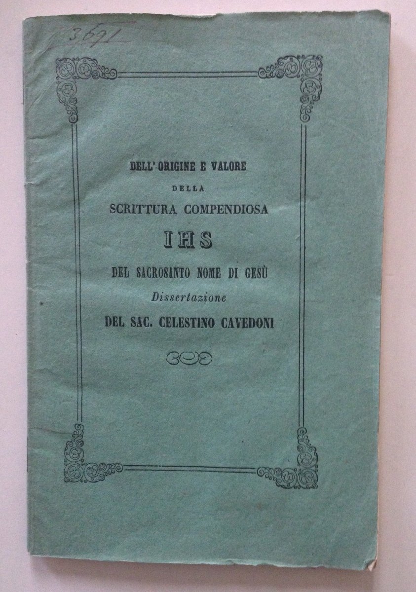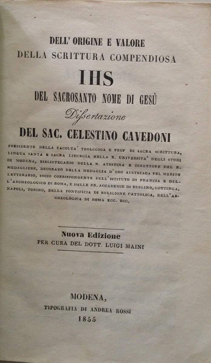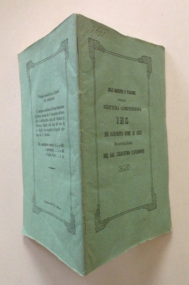 Luigi Maini (a cura di), Dell'origine e valore della scrittura compendiosa IHS del sacrosanto nome di Ges√π Dissertazione del Sac. Celestino Cavedoni Tipografia di Andrea Rossi, Modena 1855, cm 18x11.5, pp. 40, brossura ed. Condizioni di conservazione. Esemplare in buono stato con leggere tracce d'uso. MOD.01OP00026 MT