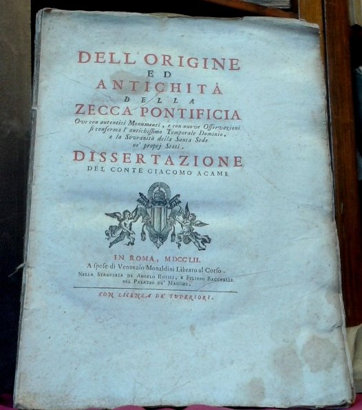 DELL'ORIGINE ED ANTICHITA' DELLA ZECCA PONTIFICIA. Ove con autentici Monumenti, e con nuove Osservazioni si conferma l'antichissimo Temporale Dominio, e la Sovranit della Santa Sede ne' proprj Stati. Dissertazione del Conte Giacomo Acami.