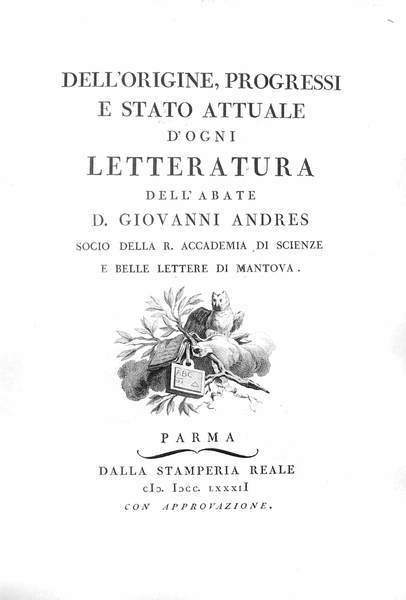 In-4 p. (mm. 285 x 200), 8 volumi, mz. pelle ottocentesca (dorsi rifatti), pp. (4),XIII,(3),531; XV,515; (6),675; XII,(2),607; (8),708; XVI,586; (6),587-841,87,(3); X,(4),319; bella e differente vignetta al frontesp. di ogni volume (4 incise in rame e le altre inc. su legno). Raro trovare l'opera completa perché il volume VIII fu stampato solo nel 1822 dalla Tipografia Ducale e si vendette separatamente. Vi sono contenute le aggiunte e correzioni fatte dallo stesso A. per l'ediz. di Roma, 1808-1817. "Prima edizione".Cfr. Brunet,I,276: Ouvrage savant, qui a été réimprimé plusieurs fois" - Brooks,294 - Choix de Olschki,IX,12860 - Graesse,I,123 - Palau,I,77 - Gamba,2532: "acclamatissima opera". Solo nel vol. IV le ultime 110 carte ondulate per tracce di umidità al marg. infer., altrimenti fresco esemplare, molto ben conservato."Giovanni Andrès (1740-1817), gesuita ed erudito spagnolo, fu uno degli ultimi eredi e prosecutori dell'enciclopedismo settecentesco, abbracciando nel concetto di letteratura la storia della cultura e del progresso scientifico; noto soprattutto per la sua opera in italiano Dell'origine.. che comprende anche la trattazione dello sviluppo delle scienze".Così Diz. Treccani,I, p. 428.