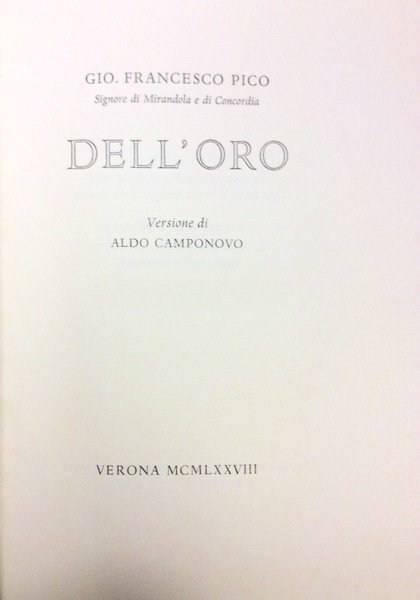 In-16 gr., p. pergam. editoriale, astuccio, tagli super. dorati, pp. 188,(4). Il trattato di Giovan Francesco Pico (nipote del più grande Pico) si compone di tre libri. Nel primo, l'A. tende a storicizzare il discorso sull'oro, mostrando che non sempre fu tenuto in così gran conto da essere preso per misura di tutte le cose', e che scarse sono le sue proprietà mediche e discutibile la sua utilità. Nel secondo si dimostra che è lecito e possibile far l'oro per arte. Nel terzo vengono riferiti recenti e remoti risultati dell'arte chimica e metallurgica.Come si precisa nel colofon, questa edizione, stampata per Carla Camponovo, è la prima opera impressa al torchio dell'Officina Bodoni, dopo la scomparsa del suo fondatore Giovanni Mardersteig, in 300 esemplare numerati. il ns., C, fa parte della tiratura di I-CC in numeri romani, ed è in ottimo stato.