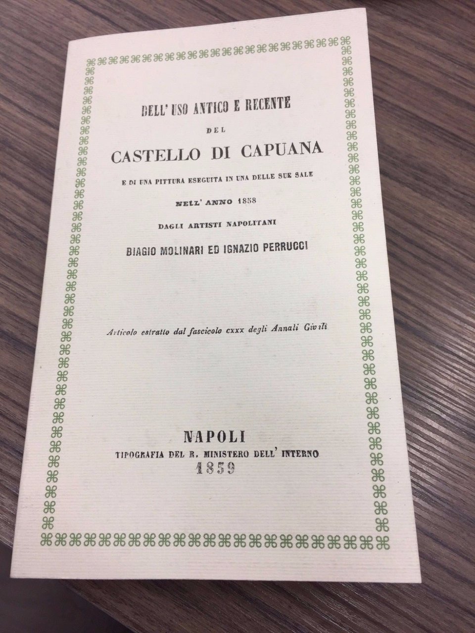 E di una pittura eseguita in una delle sue sale nell'anno 1838 dagli artisti napoletani Biagio Molinari ed Ignazio Perrucci. Ristampa anastatica dell'edizione Napoli 1859, 16°, pp. 130. Stampato dalle edizioni Giannini 2001. Brossura.