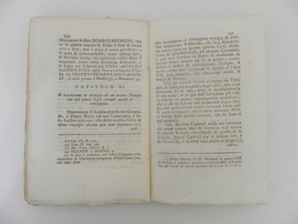 8°, pp. XII, 234; 12 tavole fuori testo, copertina muta coeva con mancanza al dorso, piccolo segno di tarlo alle prime 4 carte. antica etichetta con precedente collocazione al contropiatto. Qualche brunitura, qualità della carta, esemplare molto buono. Vermiglioli fu un archeologo e numismatico umbro, che con le sue ricerche contribuì ad incrementare il museo archeologico di Perugia. In quest'opera viene fornita la storia di Arna, città probabilmente di origine etrusca, e dei ritrovamenti archeologici effettuati in quelle zone. Raro. *** TUTTI I NOSTRI LIBRI SONO VISIBILI PREVIO CONTATTO MAIL O TELEFONO NELLA NUOVA SEDE DI MILANO: LIBRERIA COSMOPOLIS, VIA JOMMELLI, 22. ***