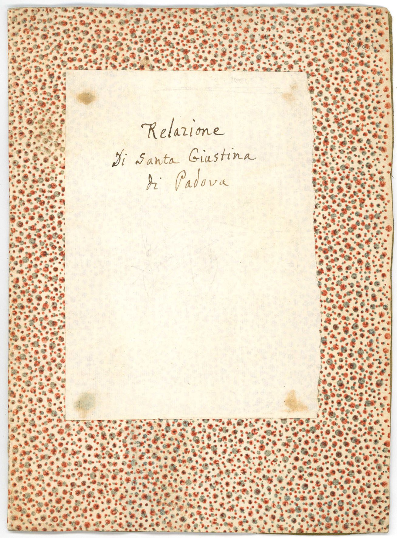 Copia manoscritta di fine Settecento di questa breve relazione, apparentemente inedita, sull'importante Basilica padovana di Santa Giustina, che l'autore Pietro Vanzi dice di aver tratto dagli scritti dell'erudito Giovanni Brunacci (1711-1772), il quale, tra il 1738 e il 1739, compì diverse ricerche presso l'archivio della Basilica e copiò diverse carte che molti anni dopo gli sarebbero servite di base per la sua opera Chartarum coenobii S. Iustinae explicatio (Padova, 1763) (cf. A. Rigon & F. Rossetto, a cura di, Giovanni Brunacci tra erudizione e storia nel 3. centenario dalla nascita (1711-2011), Atti del Convegno, Accademia galileiana di scienze lettere ed arti, Padova, 22 ottobre 2011, Complesso monumentale di San Paolo, Monselice, 23 ottobre 2011, Padova, 2014).