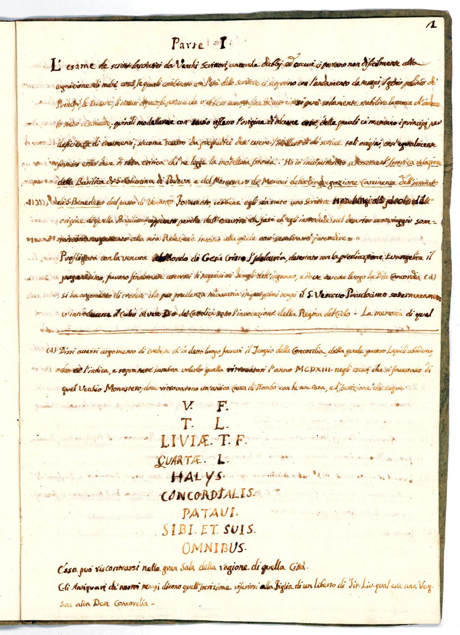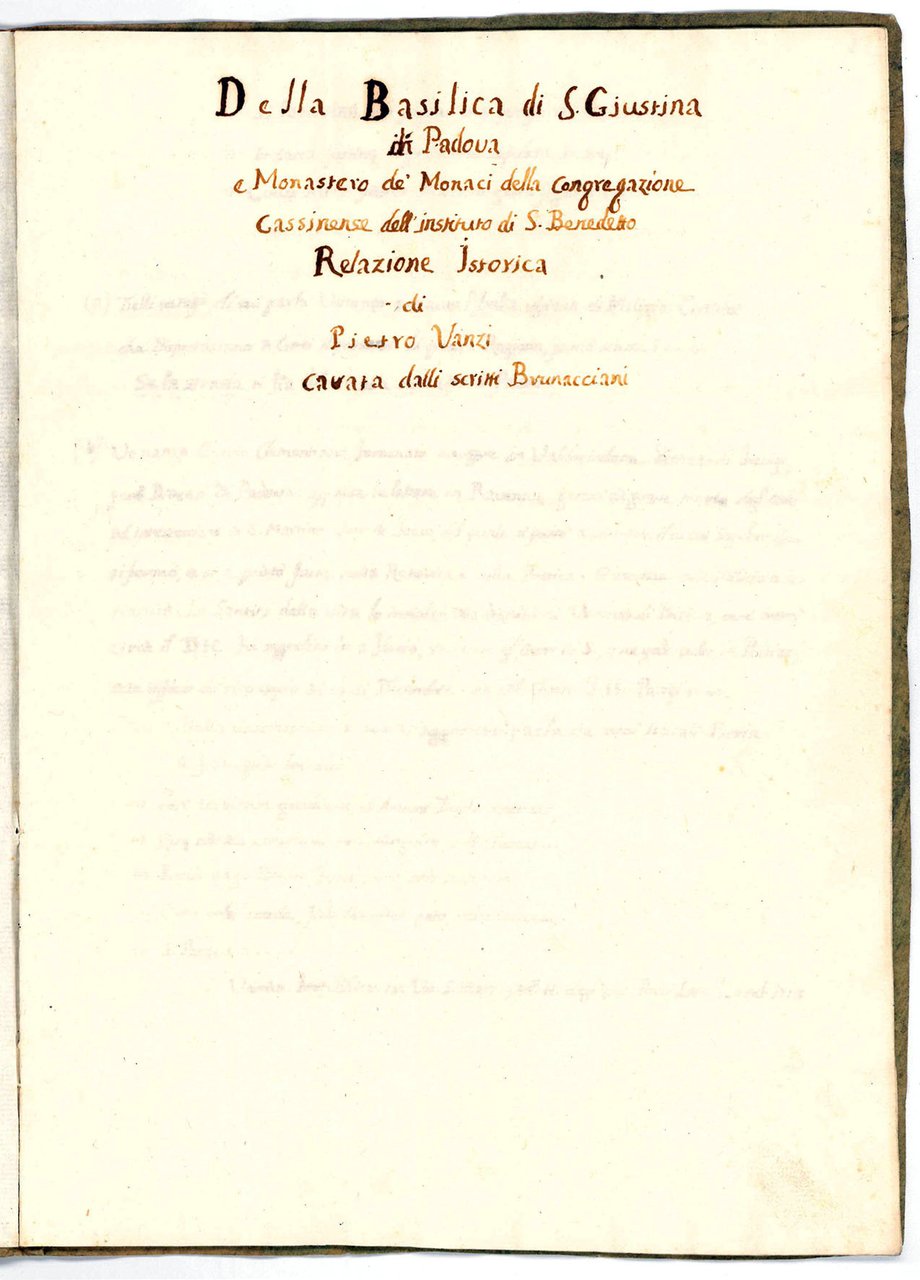 Della Basilica di S. Giustina di Padova e Monastero de' Monaci della Congregazione Cassinense dell'Instituto di S. Benedetto. Relazione Istorica di P. Vanzi, cavata dalli Scritti Brunacciani. Manoscritto su carta in italiano, fine XVIII secolo