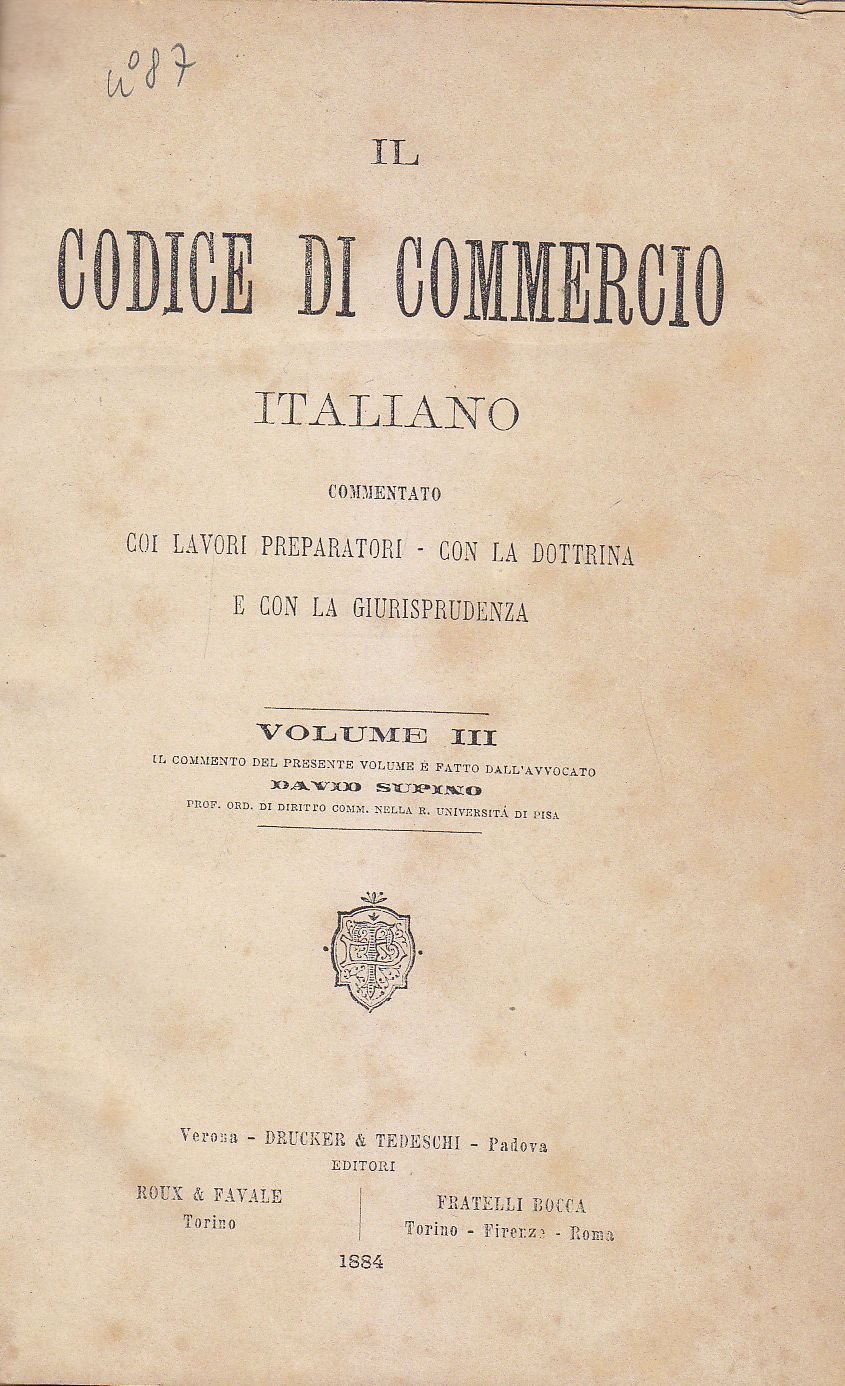 DELLA CAMBIALE E DELL’ASSEGNO BANCARIO commentato coi lavori preparatori, con la dottrina e con la giurisprudenza di David Supino. Volume III DE IL CODICE DI COMMERCIO ITALIANO.