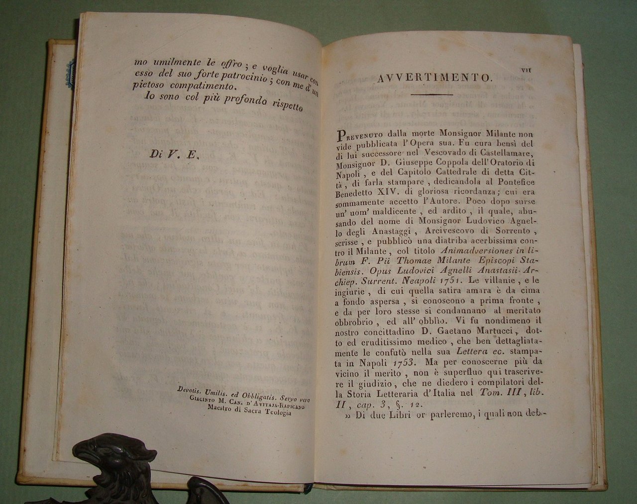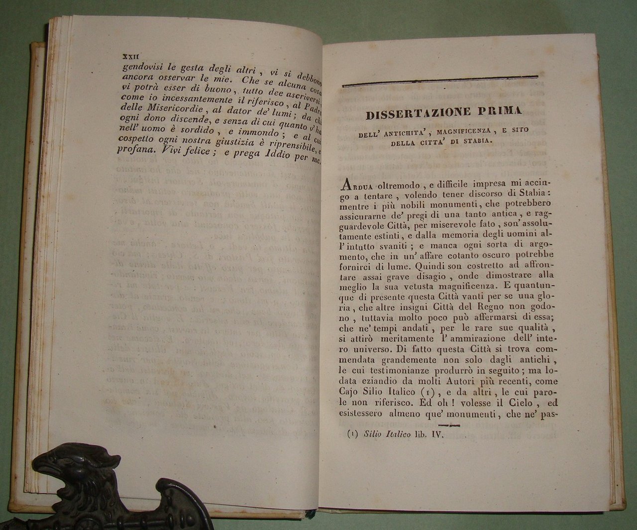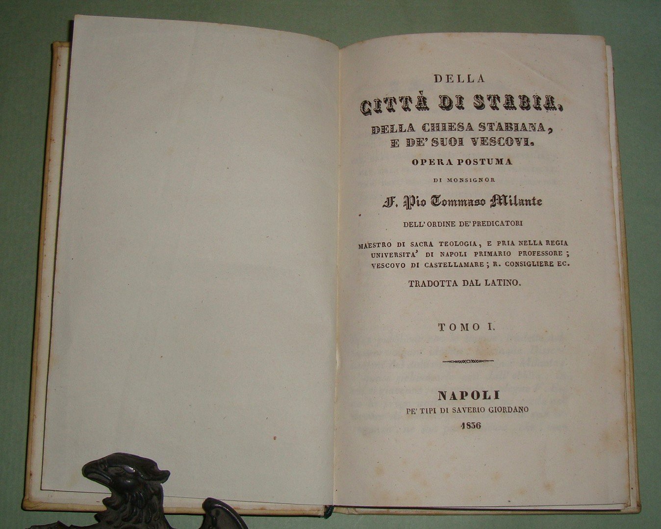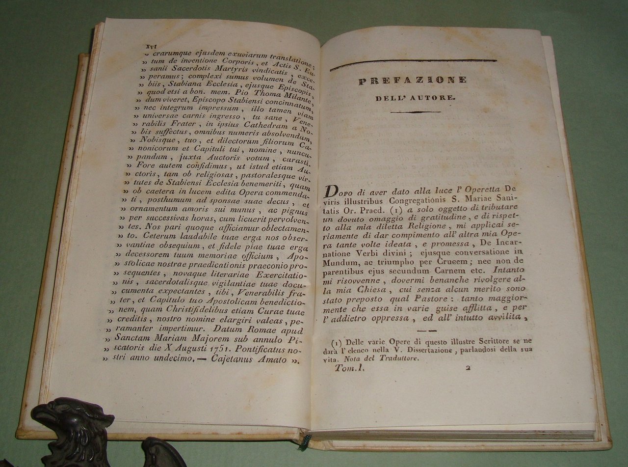 Napoli, pe' tipi di Saverio Giordano, 1836. Due tomi in un volume in 8vo; pp.XXII,189,1n.n.; 180. Pergamena coeva, tassello al dorso con titolo e fregi in oro. Bibl. Platneriana, pag.94; Furcheim, Bibliographie der Insel Capri und der Sorrentiner Halbinsel, pag.102; Giustiniani, pag.34 n.3 per l'edizione originale in latino del 1750.