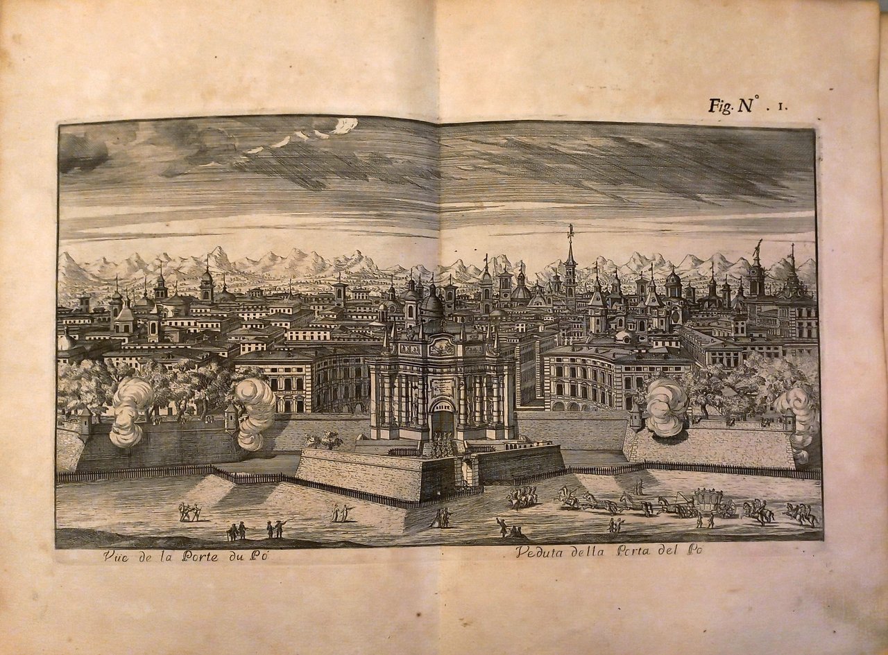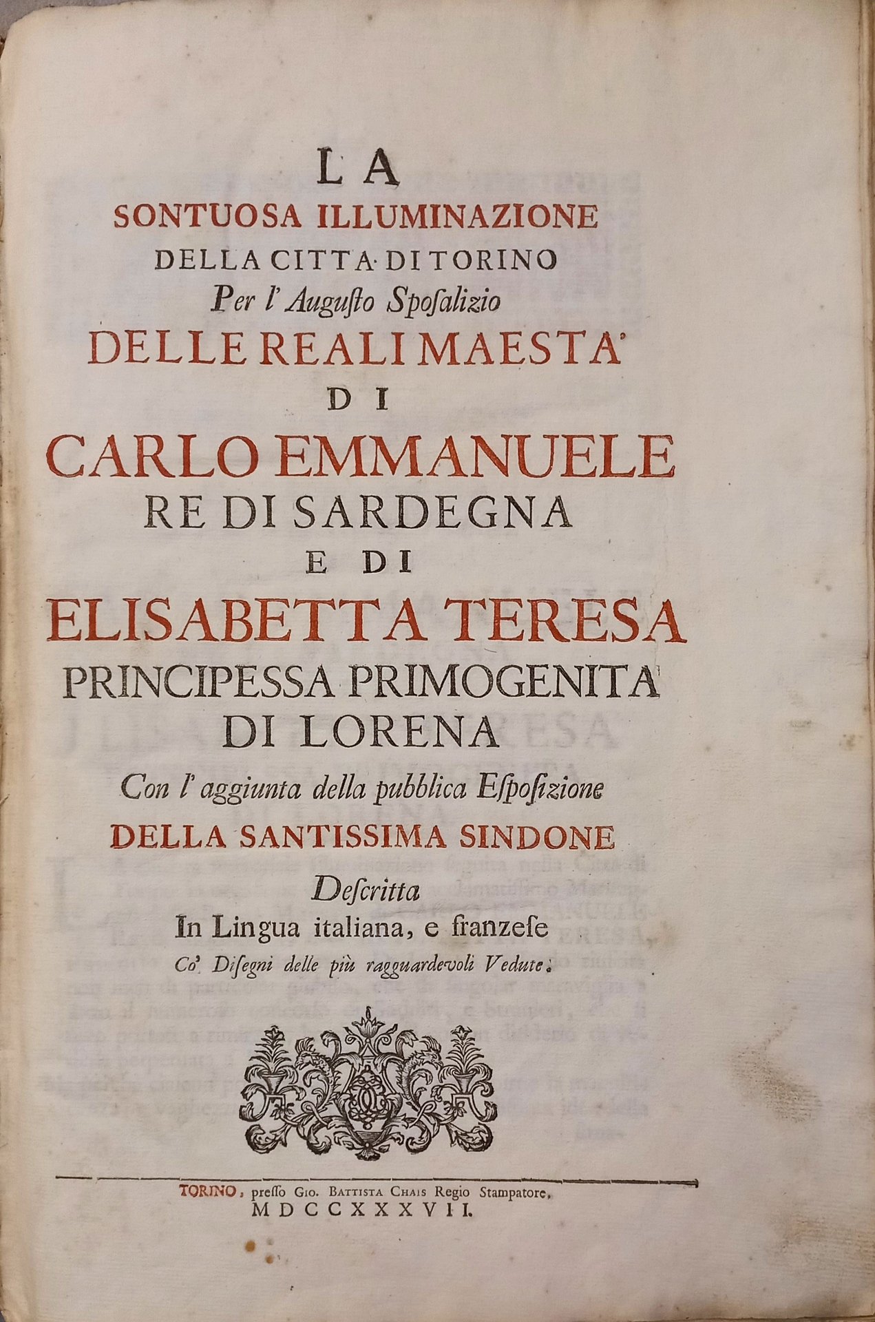 Legatura originale piena pelle con alcuni abili restauri al dorso. Volume illustrato da un antiporta incisa con le grandi armi di Savoia e di Lorena, e da 14 tavole a doppia pagina, disegnate e incise in rame da vari artisti (Vittone, Masson, Agliaudi, Daudet, Belmondo, de Prenner, Herriset) raffiguranti stupende vedute di Torino «illuminata» per il festoso sposalizio (Veduta della Porta del Po; Contrada del Po; Castello Reale verso la strada del Po, Macchina de Fuochi di Gioia, Facciata e laterali del Castello dalla parte della Dora, Veduta geometrica del Padiglione Reale, Piazza e Palazzo Reale; Piazza San Carlo; Palazzo di Città, Chiesa del Corpus Domini; Il Ghetto; Esposizione della Sindone; Vigna della Regina; Giardino della Venaria Reale).