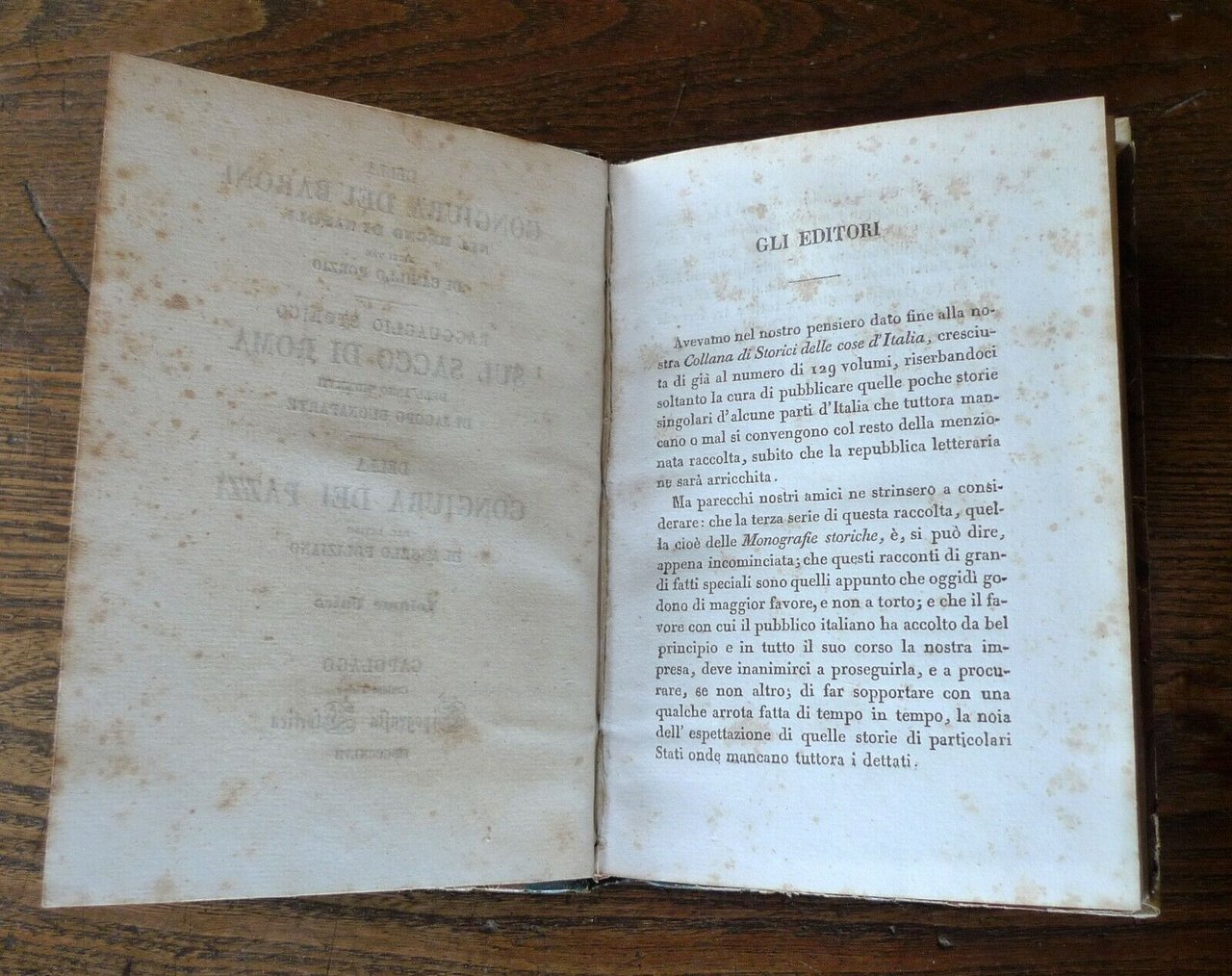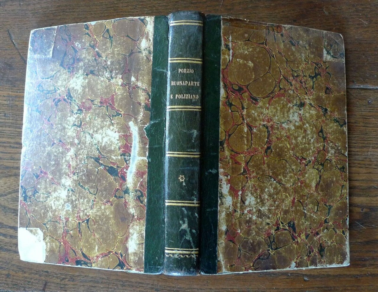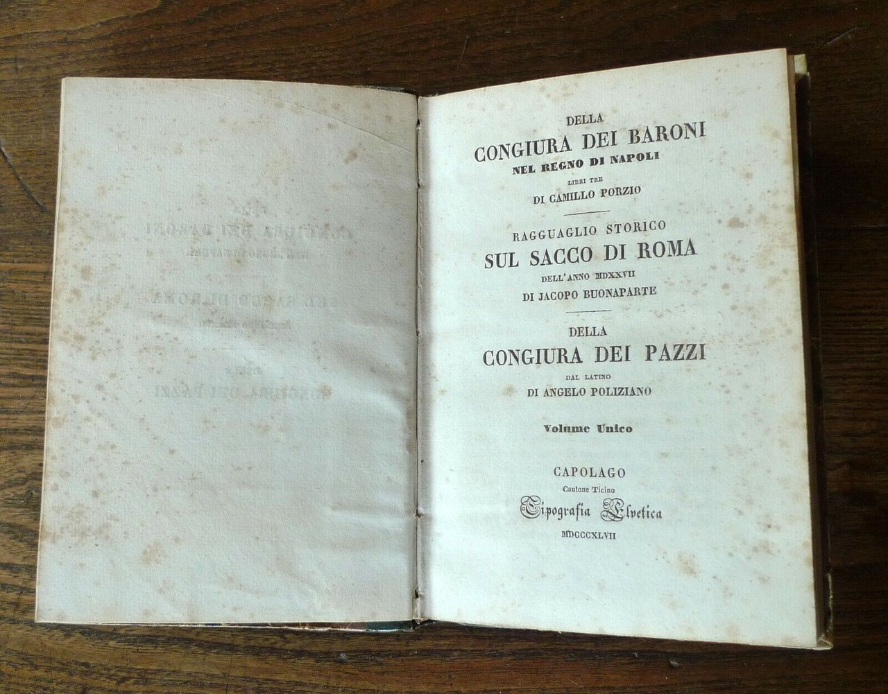 LIBRI TRE. DI CAMILLO PORZIO-RAGGUAGLIO STORICO SUL SACCO DI ROMADELL'ANNO MDXXVII. DI JACOPO BUONAPARTE-DELLA CONGIURA DEI PAZZIDAL LATINO. DI ANGELO POLIZIANOVOLUME UNICO.Capolago, Canton Ticino, Tipografia Elvetica, 1847,copertina rigida, rilegatura in mezza pelle,17x11,5 cm., pp.320,peso: g.300