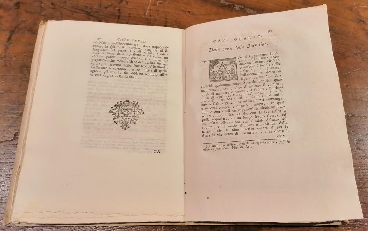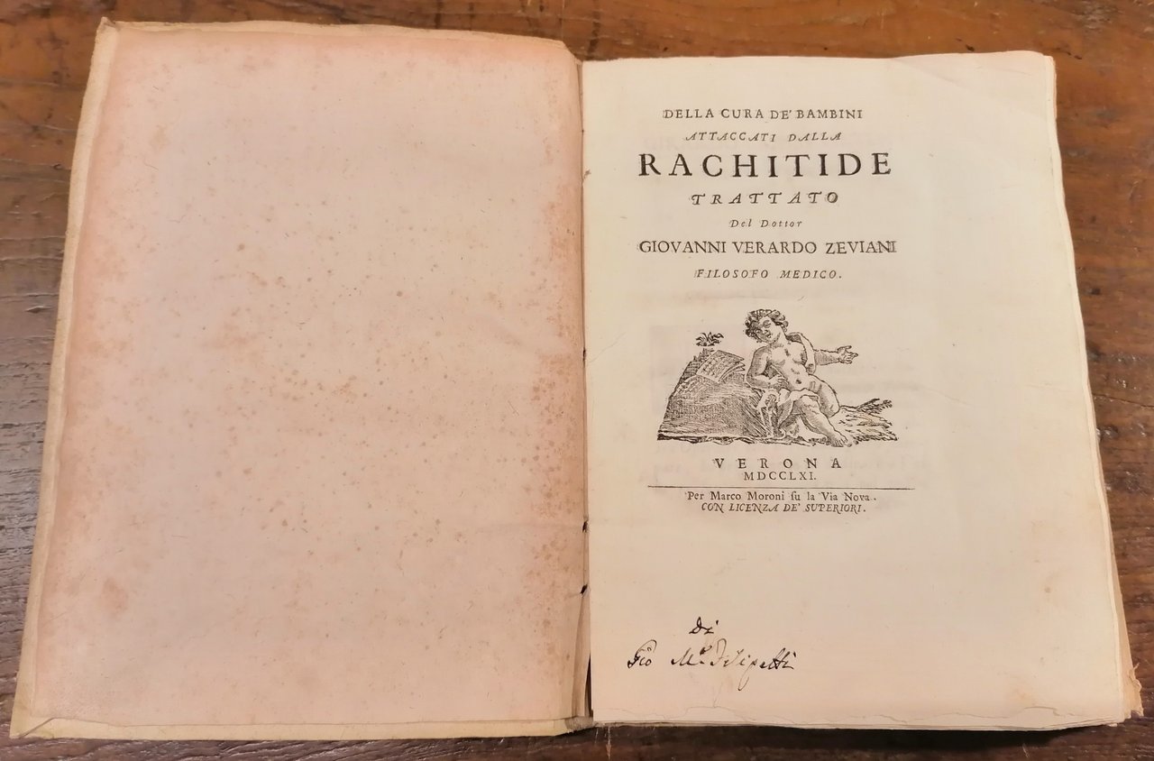 (Medicina - Pediatria - Rachitismo infantile) In 4° antico (cm 24,5 x 18), legatura in cartonato coevo con titolo manoscritto al dorso, pp. (16),164, con marca tipografica al frontespizio e capolettera ornati in xilografia. Prima edizione. Antica firma di proprietà al margine inferiore bianco del frontespizio. Leggere ed ininfluenti tracce di ossidazione alle guardie, ottimo stato di conservazione.