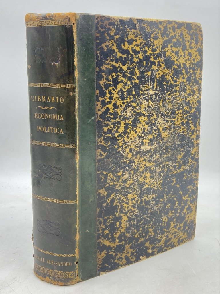 Legatura coeva in mezza pelle verde con titoli dorati e fregi a secco sul dorso; 8vo cm 22x14, pp XX 614; numerose tabelle. Esemplare genuino e complessivamente ben conservato; sul frontespizio abrase le parole “LIBRI III” e manoscritto in mano antica “Cibrario”, prima sguardia lievemente sgualcita, usurate le cerniere. Dopo una prima stagione in cui dedicò i suoi studi alla storia del Piemonte e della Casa Savoia, Cibrario affrontò un tema di più ampio respiro, ispirandosi ai lavori di Blanqui e della scuola storiografica tedesca in questa che “non è tanto un'opera di storia dell'economia politica, quanto una storia del Medioevo con l'originale aggiunta della legislazione che regolava i commerci, e le notizie e i prezzi di un ricchissimo ventaglio di oggetti di quell’età” (Fubini-Leuzzi). Lo studio fu tradotto in francese e tedesco e ottenne notevole successo all’estero, apprezzato in particolare per l’ampio utilizzo di fonti inedite, l’istituzione di un metodo per calcolare il rapporto fra il valore delle monete antiche e quello delle moderne attraverso l’analisi del prezzo del grano, l’indagine statistica dei prezzi di molteplici derrate, lo studio della proprietà e della demografia, l’attenzione alle leggi finanziarie e del commercio, la disanima del funzionamento dell’erario pubblico e del sistema monetario. La prima parte dell’opera, dedicata alla “Condizione politica”, utilizza fonti per lo più edite e traccia una storia comparata delle istituzioni e del diritto nei paesi europei; la seconda parte (“Condizione morale”) utilizza molte fonti inedite e tratta dei processi inquisitoriali contro le streghe e gli eretici, delle feste e giostre, degli ordini religiosi, degli istituti di carità; la terza parte è prettamente economica ed è arricchita di moltissime tabelle coi prezzi di merci e beni. Opera rigorosa che tende ad astenersi dalle posizioni ideologiche che agitavano la storiografia italiana dell’epoca, lascia tuttavia trasparire una posizione filo-piemontese individuando nel governo sabaudo la migliore incarnazione della vocazione alla giustizia e stabilità propria secondo l’autore della monarchia. Non comune edizione originale. Manno-Promis I, 1747; Einaudi 1092.