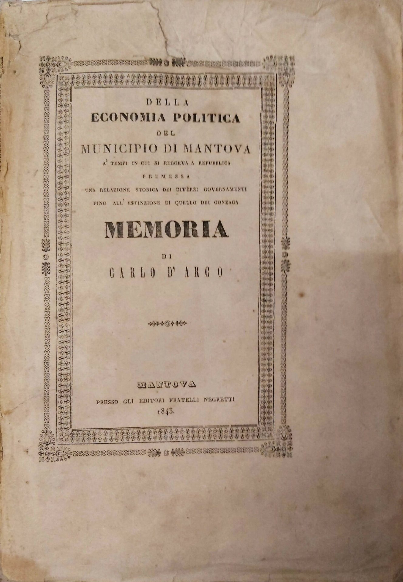 DELLA ECONOMIA POLITICA del Municipio di Mantova à tempi in cui si reggeva a Repubblica. Premessa una relazione storica dei diversi governamenti fino all’estinzione di quello dei Gonzaga. Memoria di. corredata di documenti autentici per gran parte inediti e di alcune tavole.