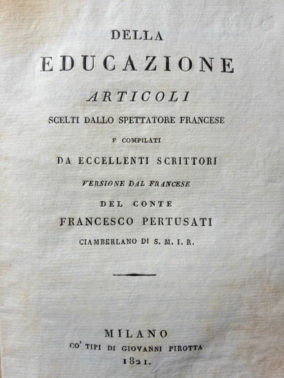 In-8° (cm. 19), brossura coeva con titolo su etichetta al dorso (lievi usure), pp. 258 [4] in buono stato, con fioriture sparse e lievi gore, antica firma di possesso al contropiatto. Opera di reazione alle novità educative che contiene, tra l'altro: Indirizzo dei preti delle montagne del Vivarese a Bonaparte dopo la morte di Pio VI; Contro l'educazione irreligiosa e totalmente materiale; Sopra l'Emilio di Gian Giacomo Rousseau; Lo storico degli assurdi pedagogici; Sopra la mollezza dell'educazione; sopra il suicidio d'un giovinetto a dodici anni; etc. Buon esemplare. (SK5)