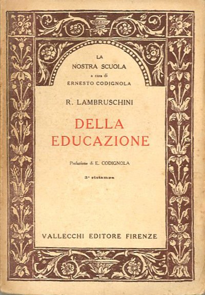 3. ed. XI, 227 p. ; 19 x 13 cm. La nostra scuola, 13. Raffaello Lambruschini può essere considerato il maggior esponente del cattolicesimo liberale in Italia nel 19. secolo per ciò che concerne l'elaborazione pedagogica. La sua concezione dell'educazione è fortemente influenzata dalla priorità che lui stesso attribuisce all'educazione morale, che diventa quindi il filo conduttore del suo pensiero. L'autore prende lo spunto dall'osservazione di come l'educazione in famiglia non è più basata sull'autorità dei genitori nei confronti dei figli, ma essa è stata soppiantata dall'amore. Di conseguenza se prima i bambini erano degli schiavi in famiglia, ai tempi dell'autore, anche in conseguenza delle teorie espresse da Rousseau, essi erano improvvisamente diventati padroni. Inutile specificare che entrambi gli estremi sono considerati dannosi dal Lambruschini che, nella sua teorizzazione educativa, si sforza dunque di trovare una via di uscita da questa errata dicotomia. L'uomo, se da una parte possiede una sua morale interna, dall'altra è sottoposto al dominio delle sue passioni e alle pressioni sociali e culturali: bisogna dunque arrivare a vedere libertà e autorità in un rapporto di correlazione. L'autorità va impiegata per aiutare l'uomo a farsi libero, sulla base di principi morali di cui è portatore. Questo vale naturalmente per ogni tipo di autorità, da quella sociale a quella religiosa a quella educativa. Infatti, l'educatore se non potrà permettersi di abbandonare l'alunno a stesso, con il rischio di vederlo soccombere alle sue passioni o agli influssi negativi della società, dovrà cercare una mediazione pedagogica tra ragione e sentimento, volta a insegnargli come dare ascolto alla sua coscienza (parte del sentimenti) e come impiegare il suo pensiero per diventare, attraverso la conoscenza e il confronto con il mondo e la parola di Dio, padrone di se stesso (parte della ragione). L'educazione si prospetta dunque come un compito complesso in quanto da una parte essa deve essere contemporaneamente indiretta e diretta. Nuova edizione curata da E. Codignola. Brossura editoriale, coperta in cartoncino flessibile, titolo impresso in rosso al piatto e in nero al dorso. Titolo al piatto in riquadro con motivi floreali. Libro intonso, alcuni segni del tempo alla coperta e ai profili, taglio e pagine interne ingiallite con qualche fioritura. Codice libreria 4856.