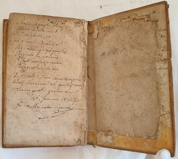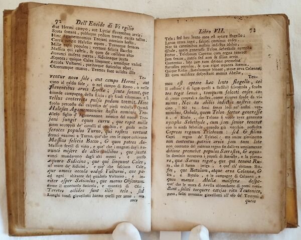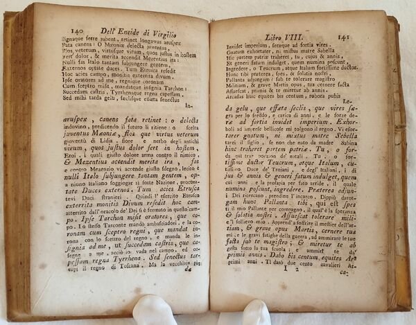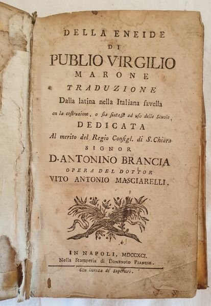 Edizione napoletana del 1791 della famosa traduzione del capolavoro virgiliano "Eneide" ad opera di Antonio Masciarelli. Antico manoscritto firmato e datato 1831 al verso del frontspizio, un piccolo foglio aggiunto, verso dell'ultima carta 241. In buone condizioni ma in parte slegato. Copertina in piena pergamena coeva con titolo in oro al dorso in buone condizioni generali con lievi usure ai margini e dorso. Legatura in discrete condizioni con lievi rotture. Corpo del libro in parte staccato. All'interno le pagine si presentano in discrete condizioni con fioriture. In 8. Dim. 19,5x12 cm. Pp. 241+(1).Neapolitan edition of 1791 of the famous translation of the masterpiece of Virgil "Eneide" by Antonio Masciarelli. Antique handwritten text dated 1831 in the verso of title page, a little added page, verso of the last page 241. In good conditions but partially disbound. Parchment coeval cover with golden title in the spine in good general conditions lightly worn in the edges and spine. Binding in fair conditions with light cracks. The body of the book partially detached. Inside pages are in fair conditions with foxings. In 8. Dim. 19,5x12 cm. Pp. 241+(1).