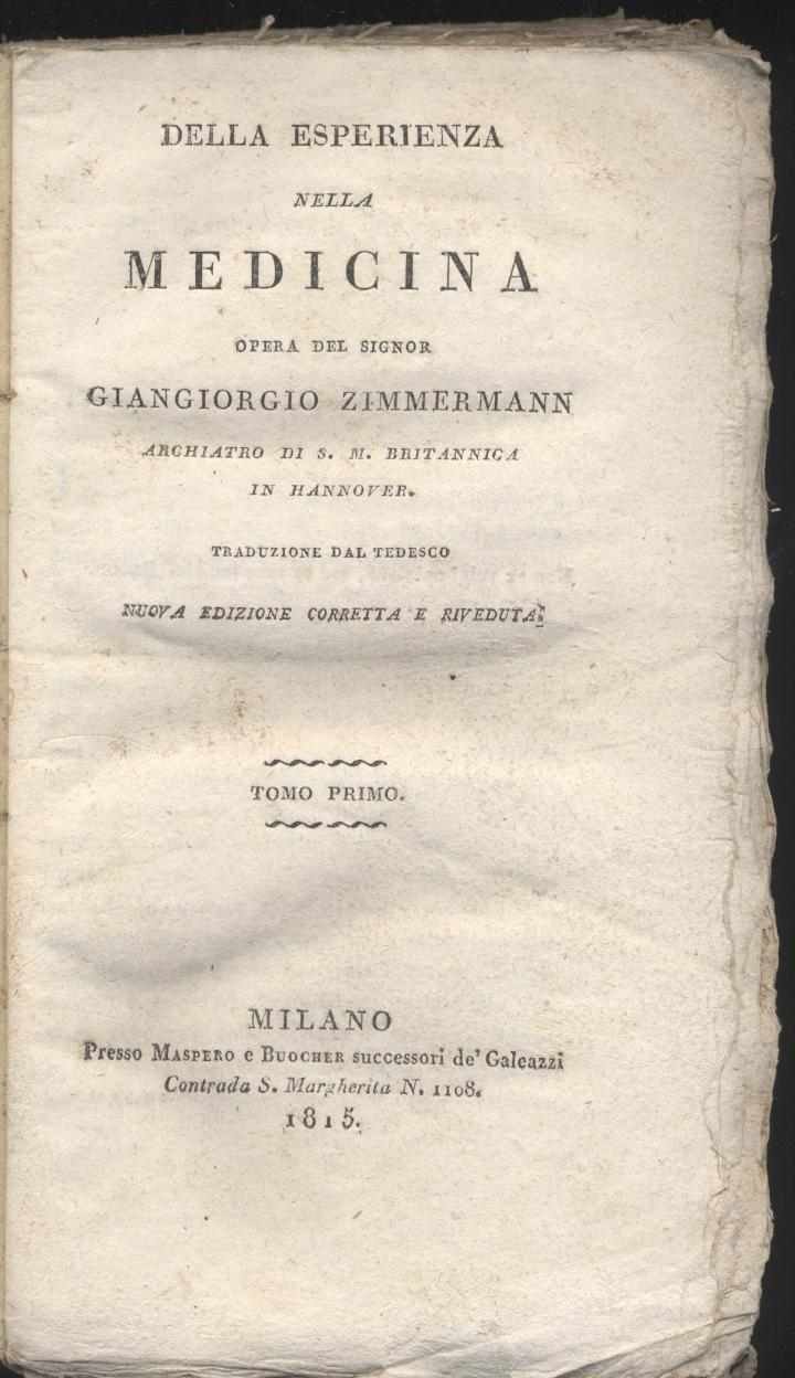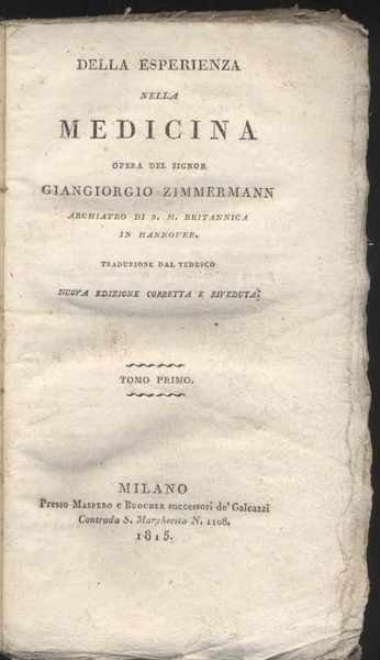 Della esperienza nella medicina opera del signor Giangiorgio Zimmerman archiatro di S. M. britannica in Hannover traduzione dal tedesco - Nuova edizione corretta e riveduta Tomo primo