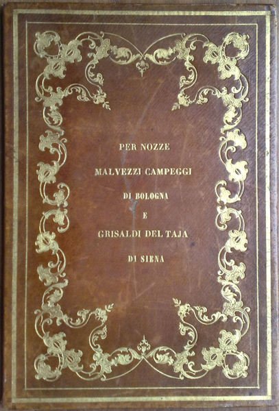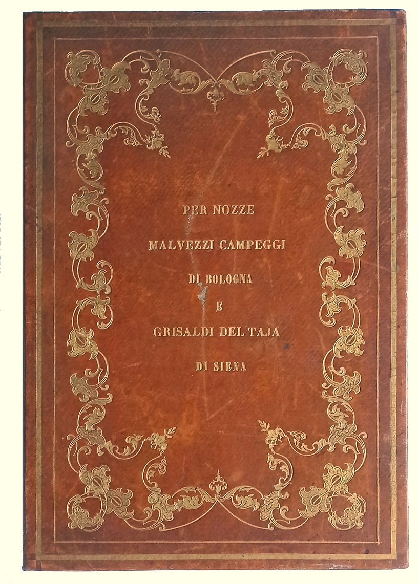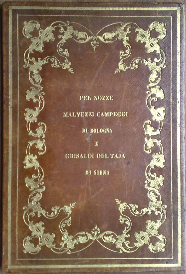 In 8 gr., p. 63 [1], con una tav. incisa f.t. (raffig. "Il Toscolano Villa de' Campeggi" e "La Rocca di Dozza de' Campeggi". Ottima leg. coeva in piena pelle con ricchi fregi floreali e cornici in oro ai piatti, tit. al piatto ant.