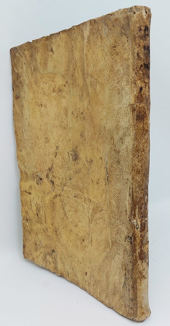 >in-4 (200x145 mm), pp. 104, (1), leg. coeva in p. pergamena; al frontespizio vignetta di una lesina da calzolaio con motto: ''L'assottigliarla più meglio anche fora'', capilettera ornati, testatine e finalini. Edizione tardo cinquecentesca con aggiunte, assai rara, secondo Westbury e Bi.N.G. è la terza, preceduta da l'edizione di Ferrara (Baldini, 1590) e da una misteriosa edizione originale, forse fiorentina, senza luogo né data ma impressa comunque nell'ultimo ventennio del XVI sec., ne esiste però un'altra, che precede la presente, impressa in Vicenza, per istanza di Baretti nel 1589. Noto libro burlesco che presenta gli umoristici statuti di una immaginaria Accademia di taccagni con sede a Firenze. La finalità della Compagnia era quella di consigliare grettissime economie, anche gastronomiche, e di raccontare le rocambolesche avventure di noti e meno noti avari affiliati alla compagnia. Il significato della parola ''lesinare'', entrata nel gergo comune nell'ottocento, sembra derivare proprio da quest'opera, la compagnia ha infatti come simbolo una lesina, per l'abitudine, tra le altre spilorcerie, di ripararsi le scarpe da sé. Esemplare con serie mende all'angolo sup. dei primi fogli e lavoro di tarlo), per il resto ben conservato. Westbury, 97.  B.I.N.G., 1131 (ed. più tarda, ma cita anche la presente).