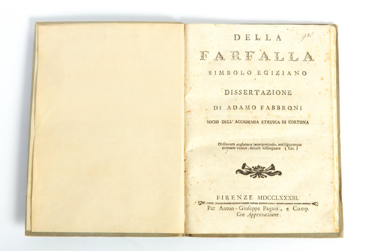 16°, mm 185x130, pp. 49; legatura in cartoncino muto moderno, titolo manoscritto al dorso. Prime pagine lievemente ingiallite, minima fioritura al frontespizio, peraltro ben conservato. Dedica all'Accademia Etrusca di Cortona. Edizione originale censita in poche copie nelle biblioteche italiane. Questa dissertazione erudita tratta non solo del significato della farfalla nell'antico Egitto, in Grecia e in Medio Oriente.. *** TUTTI I NOSTRI LIBRI SONO VISIBILI PREVIO CONTATTO MAIL O TELEFONO NELLA NUOVA SEDE DI MILANO: LIBRERIA COSMOPOLIS, VIA JOMMELLI, 22. ***