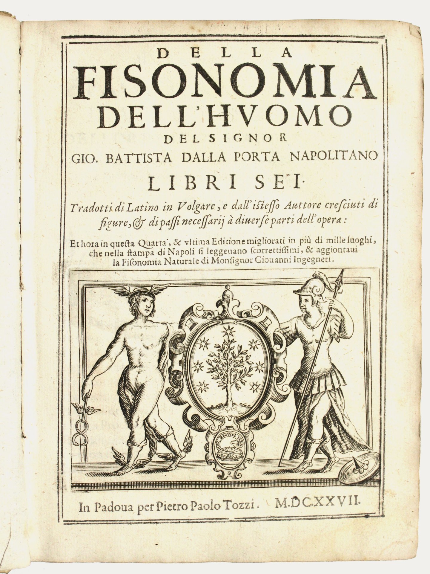 In 4°(mm 220x155); carte non num. 8, carte num. 222, compreso l'occhietto; pagg. 64; 32; pagg. (12), 147. Frontespizi con grande vignetta in rame, capilettera istoriati entro elementi fitomorfi, testatine e finalini silografici, ritratto a p. p. del Cardinale d'Este a cui l'opera è dedicata, ritratto a p. p. del Dalla Porta, inc. in legno. Centinaia di affascinanti incisioni sempre in legno nel testo, molte a piena pag. Piena pergamena rigida coeva, titolo manoscritto al dorso.<BR>Secondo Dalla Porta dall'aspetto e il temperamento dell'uomo si possono trarre conclusioni sulle qualità mentali e del carattere, riconoscere quindi in tutti gli esseri animati le inclinazioni dell'animo dai tratti somatici; il giusto e l'ingiusto, l'uomo dabbene, l'uomo cattivo, il fedele e l'infedele, il prudente e imprudente, l'ingegnoso fino agli esempi massimi di vizio e di virtù rappresentati nell'ordine dal "ferino o bestiale", passando in rassegna una sequela di ritratti morali ricavati dall'aspetto fisico, conclude l'opera con una serie di rimedi di carattere medico terapeutico, vale a dire con esercizi, diete, purghe, salassi vari. <BR>Ottimo esemplare, mancanza alla cuffia superiore, sporadiche fioriture.<BR>Casanatense (in riferimento alla celeste fisonomia) 1616.<BR><BR>