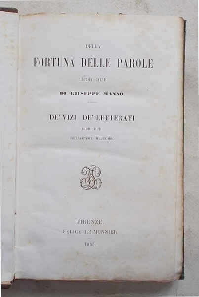 In 16° (cm. 19 x 12,5); pagg. 430; mezza pelle dell'epoca con titoli e fregi in oro al dorso. A pieni margini. VG-. ** Due opere, pubblicate in un unico volume. L'editore commenta la prima opera scrivendo: "il ricercare le vicissitudini e i tramutamenti del significato delle parole è studio filosofico molto fecondo", mentre della seconda commenta: ". con gioviale e nobile sincerità che nota i difetti e scherzando modestamente corregge e ammaestra".