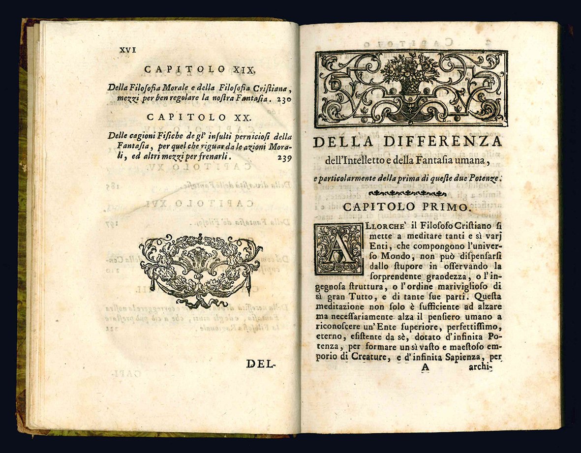 In 8vo piccolo (mm 173x112); pp. XVI, 256. Segnatura: a? A-Q?. Marca xilografica al frontespizio (Minerva in piedi che regge uno scudo e un libro. Motto: La felicita delle lettere); frontalini, finalini e capilettera xilografici. Leggerissima brunitura e fioriture diffuse.
