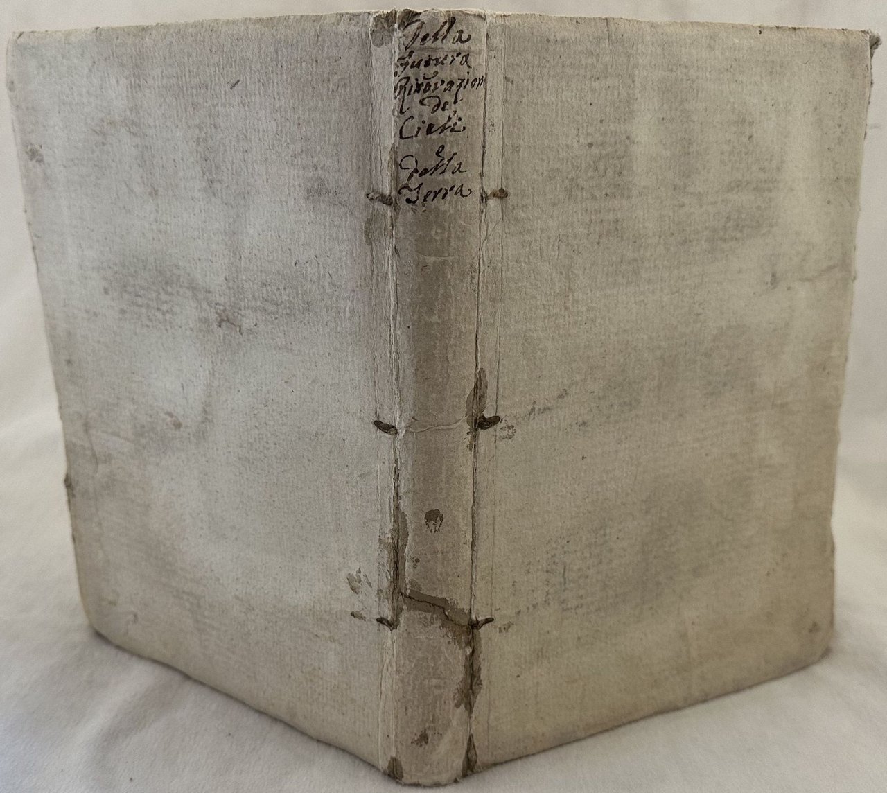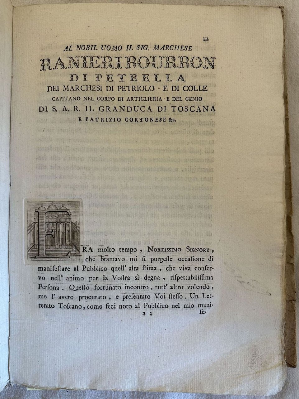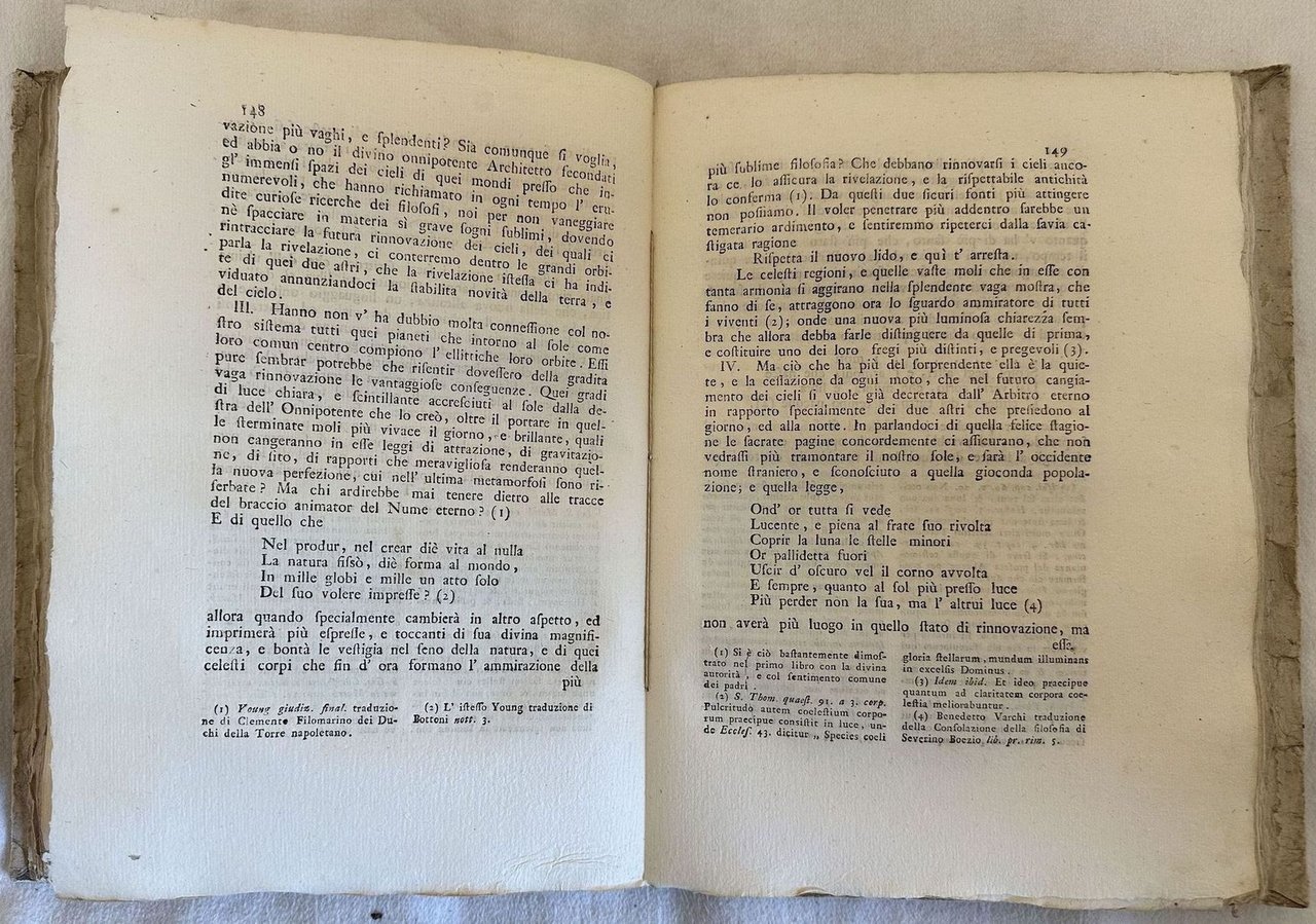 Prima e unica edizione del 1780 di questa opera utopica del frate domenicano Pier Vincenzo Barsanti (sec. 18 2 meta) nativo di Livorno. Il nome dell'autore si evince da pag. IV. L'opera è un interessante dissertazione filosofica sull'utopica creazione di un nuovo mondo i cui abitanti sono uniti da un senso di armonia e perfino da una lingua univrsale All'interno: Osservazioni sulle acque del diluvio universale, la Divina Rivelazione, Lo scrittore Cadonici (che scrisse di abitanti extraterrestri N.D.V.), Plagi di Omero e Esiodo, Rinnovazione del mondo: costituzione leggi e armonia dei membri del nuovo mondo, agricoltura arti e commercio, futura del nuovo mondo rinnovato, Arte del navigare, Oracoli divini che cofnermano la creazione futura di un nuovo modno, Nuovi oggetti che potranno sorprendentemente scorrere in immensi spazi e trovarsi da un pianeta ad un altro toccando la molteplicità dei mondi, creazione di una lingua universale. Lo scritto molte polemiche sopratutto presso i giansenisti e negli ambienti ecclesiastici romani dove l'autore fu addirittura accusato di molinismo. Frontespizio calcografico con stemma del dedicatario, Ranieri Bourbon di Petrella dei Marchesi di Petriolo e di Colle. Carta forte rustica. In buone condizioni. Copertina cartonata coeva con titolo manoscritto al dorso in buone condizioni generali con lievi usure ai margini e dorso. Legatura in buone condizioni. Pagine in ottime condizioni con rare fioriture. In barbe. In 8. cm 27,5x20,5. Pp. VII+(1)+260. First and unique edition of 1780 of this utopic work byt he dominican friar Pier Vincenzo Barsanti (sec. 18 2 meta) born in Livorno. the name of the author is indicated in pag. IV. The work is a phylosophical dissertation about the possibility of creation of a New utopic World with armony between inhabitants, objects flowing from one planet to others, a universal language. The work provoqud many discussions above all among the jansenists and in rome where the author was accused of molinism. Calcographic title page with coat of arms of dedicatary Ranieri Bourbon di Petrella dei Marchesi di Petriolo e di Colle. Strong paper. In good conditions. Carton coeval cover with handwritten title in the spine in good conditions lightly worn in the extremities. Binding in good conditions. Pages in very good conditions with occasional foxing. Uncut copy. In 8. cm 27,5x20,5. Pp. VII+(1)+260.