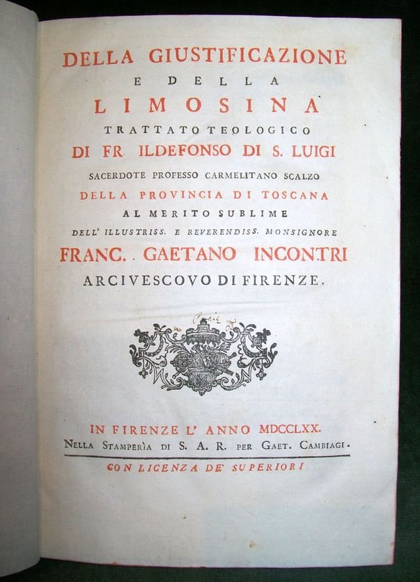In 8°, pp. XIV, 513. Mezza pergamena dei primi anni del XIX secolo. Dorso muto. Tagli rossi. Copia in ottimo stato. Trattato, dedicato all'arcivescovo Incontri, in risposta ad alcune tesi di C. Mosca Barzi sul valore espiatorio dell'elemosina.