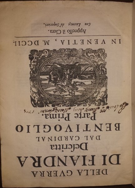 In-4 (22 cm) (4) 256 (12), 168, (8) 236 (12). Piena pergamena con titolo manoscritto al dorso. Titolo dell'occhietto: Historia di fiandra del cardinal Bentivoglio. Impaginazione errata alla fine della seconda parteBentivoglio Guido (1577-1644) è stato un cardinale, arcivescovo e storico italiano. In quest'opera storica vengono descritte, in stile eloquente e di grande presa letteraria, le guerre religiose e civili nei Paesi Bassi, che Bentivoglio osservò con occhio attento anche per il coinvolgimento diretto di ben quattro fratelli e due nipoti.