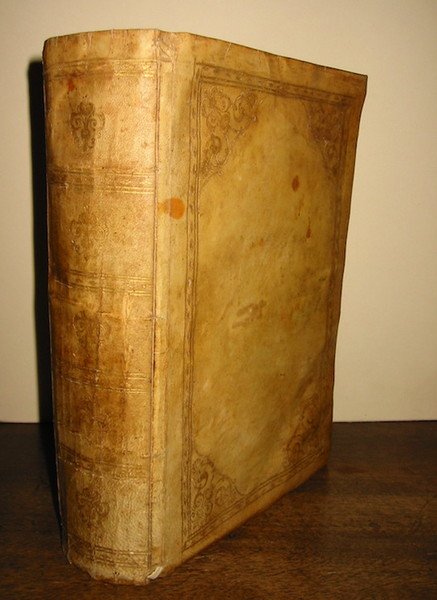 4to (cm. 23,8), 4 cc.nn. (compreso frontespizio interamente inciso su rame e ritratto dell’A.), 663(1) pp., 30 cc.nn. Fregi e capilettera xilografici n.t. Legatura coeva in pergamena con ricche impressioni in oro ai piatti e al ds. (leggermente scurita e con alcune macchie al piatto posteriore). Carte di guardia rinnovate. Ottimo esemplare. Probabile reimpressione con aggiunte dell’edizione originale del 1632. A questa prima Parte ne seguirono altre due, pubblicate rispettivamente nel 1636 e nel 1639.