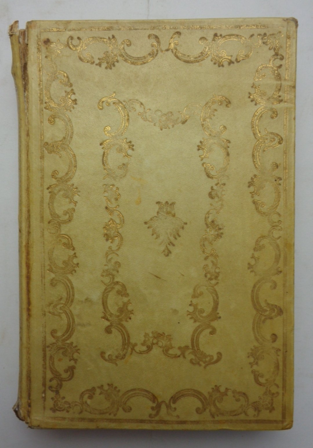Un volume (11x16,5 cm) di 427 pagine; testo inquadrato. Fioriture sparse. Bella LEGATURA in tutta pergamena rigida con duplice cornice dorata a festoni; tagli dorati. Una mancanza, purtroppo, al piede del dorso; fenditura di 3 cm circa alla cerniera anteriore, un po' scolorito il dorso. Nonostante i difetti indicati, resta un gradevole esemplare di legatura napoletana su pergamena con ricchi ornamenti dorati.