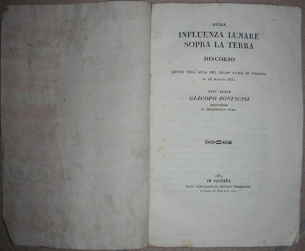 DELLA INFLUENZA LUNARE SOPRA LA TERRA. Discorso letto nell’Aula del Regio Liceo di Vicenza il 16 Maggio 1831.