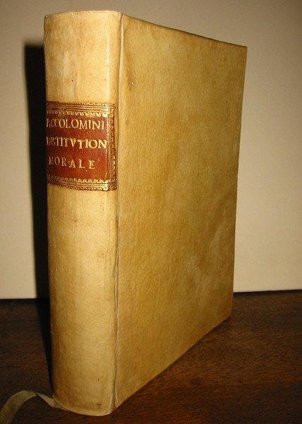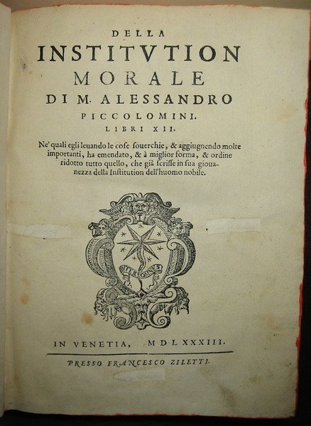 4to (cm. 20,2), 20 cc.nn., 559(1) pp. Marca tipografica al frontis. Iniziali xilografiche n.t. Legatura antica in pergamena rigida con titolo oro su tassello in pelle al ds. Antiche firme di appartenenza coperte con pecette di carta al frontis. Minimo percorso di tarlo sul margine inferiore bianco di circa venti carte. Nel complesso, ottimo e assai fresco esemplare. Cfr. Gamba (n. 1577) che cita l’edizione del 1560: ‘È una delle opere più pregevoli e meglio scritte dal Piccolomini.’. Br. Libr., 513. Altre edizioni in Adams.