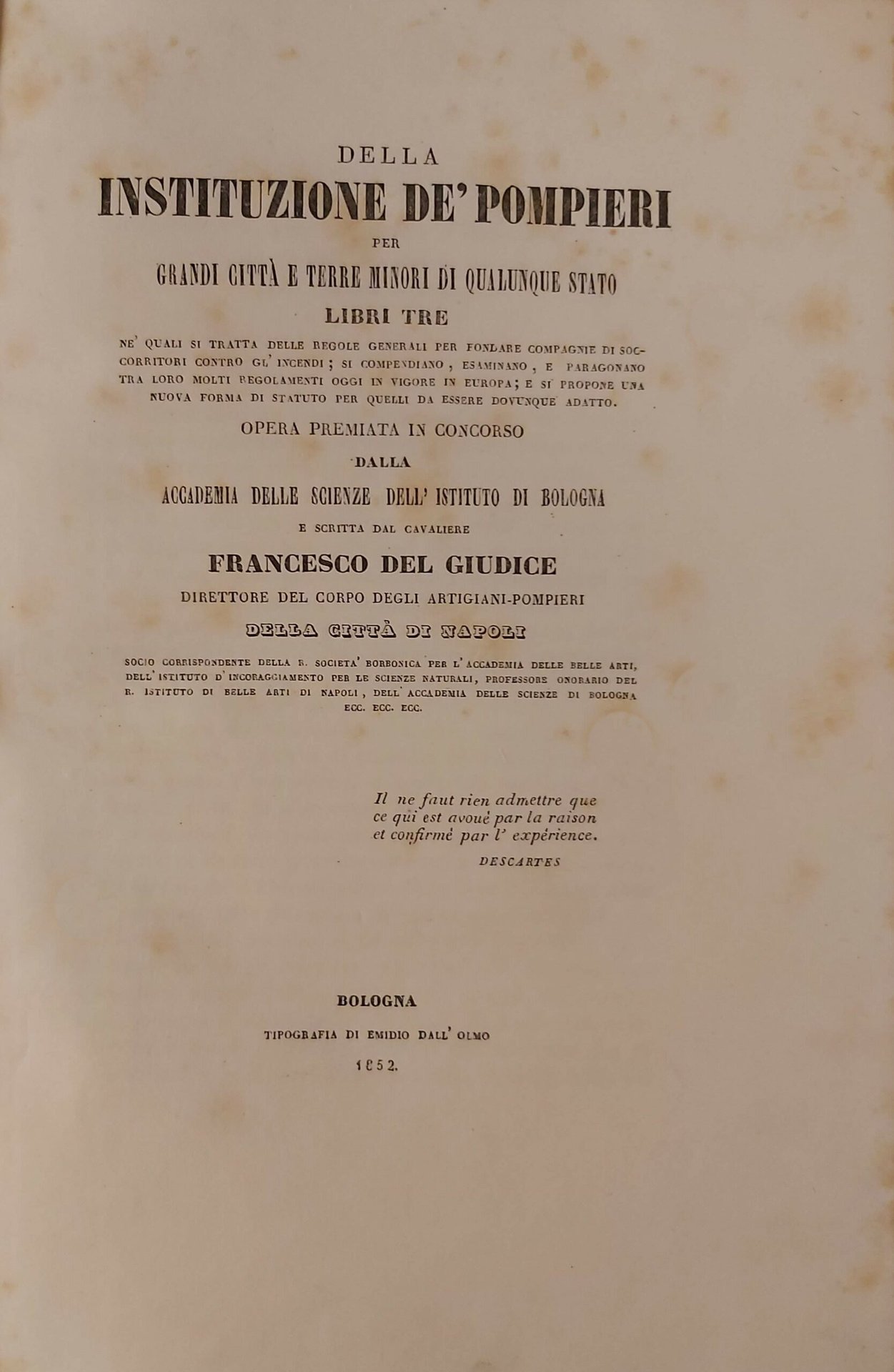in-4, pp. XVI, 244, bella leg. m. pelle coeva con tit. e ricchi fregi oro al d. Interess. opera premiata dall'Accademia delle Scienze di Bologna. L'A., di origini campane (Capua 1815 - Napoli 1880) fu comandante del primo corpo dei Vigili del Fuoco d'Italia e scienziato. Raro. Alcune lievi fioriture, bell'esempl. marginoso. [659]